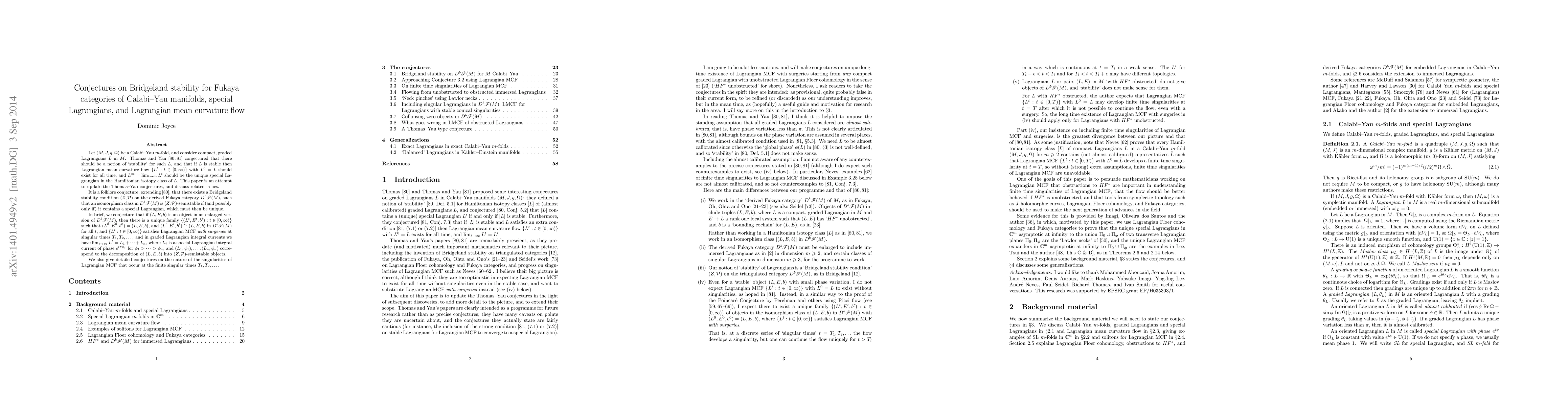 Let $M$ be a Calabi-Yau $m$-fold, and consider compact, graded Lagrangians $L$ in $M$. Thomas and Yau math.DG/0104196, math.DG/0104197 conjectured that there should be a notion of "stability" for such $L$, and that if $L$ is stable then Lagrangian mean curvature flow $\{L^t:t\in[0,\infty)\}$ with $L^0=L$ should exist for all time, and $L^\infty=\lim_{t\to\infty}L^t$ should be the unique special Lagrangian in the Hamiltonian isotopy class of $L$. This paper is an attempt to update the Thomas-Yau conjectures, and discuss related issues. It is a folklore conjecture that there exists a Bridgeland stability condition $(Z,\mathcal P)$ on the derived Fukaya category $D^b\mathcal F(M)$ of $M$, such that an isomorphism class in $D^b\mathcal F(M)$ is $(Z,\mathcal P)$-semistable if (and possibly only if) it contains a special Lagrangian, which must then be unique. We conjecture that if $(L,E,b)$ is an object in an enlarged version of $D^b\mathcal F(M)$, where $L$ is a compact, graded Lagrangian in $M$ (possibly immersed, or with "stable singularities"), $E\to M$ a rank one local system, and $b$ a bounding cochain for $(L,E)$ in Lagrangian Floer cohomology, then there is a unique family $\{(L^t,E^t,b^t):t\in[0,\infty)\}$ such that $(L^0,E^0,b^0)=(L,E,b)$, and $(L^t,E^t,b^t)\cong(L,E,b)$ in $D^b\mathcal F(M)$ for all $t$, and $\{L^t:t\in[0,\infty)\}$ satisfies Lagrangian MCF with surgeries at singular times $T_1,T_2,\dots,$ and in graded Lagrangian integral currents we have $\lim_{t\to\infty}L^t=L_1+\cdots+L_n$, where $L_j$ is a special Lagrangian integral current of phase $e^{i\pi\phi_j}$ for $\phi_1>\cdots>\phi_n$, and $(L_1,\phi_1),\ldots,(L_n,\phi_n)$ correspond to the decomposition of $(L,E,b)$ into $(Z,\mathcal P)$-semistable objects. We also give detailed conjectures on the nature of the singularities of Lagrangian MCF that occur at the finite singular times $T_1,T_2,\ldots.$