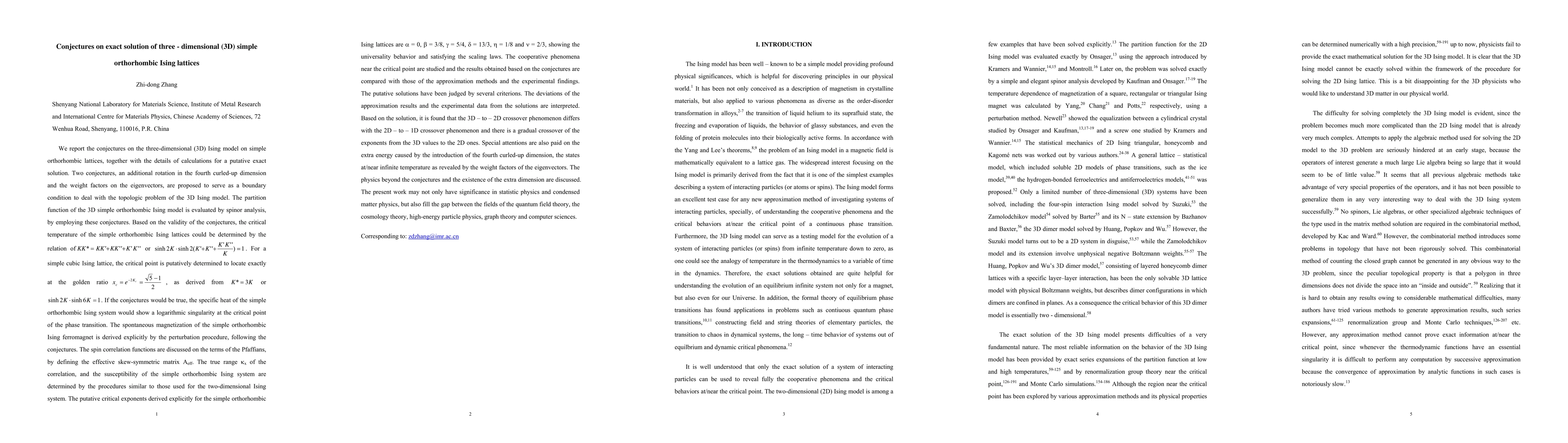 We report the conjectures on the three-dimensional (3D) Ising model on simple orthorhombic lattices, together with the details of calculations for a putative exact solution. Two conjectures, an additional rotation in the fourth curled-up dimension and the weight factors on the eigenvectors, are proposed to serve as a boundary condition to deal with the topologic problem of the 3D Ising model. The partition function of the 3D simple orthorhombic Ising model is evaluated by spinor analysis, by employing these conjectures. Based on the validity of the conjectures, the critical temperature of the simple orthorhombic Ising lattices could be determined by the relation of KK* = KK' + KK'' + K'K'' or sinh 2K sinh 2(K' + K'' + K'K''/K) = 1. For a simple cubic Ising lattice, the critical point is putatively determined to locate exactly at the golden ratio xc = exp(-2Kc) = (sq(5) - 1)/2, as derived from K* = 3K or sinh 2K sinh 6K = 1. If the conjectures would be true, the specific heat of the simple orthorhombic Ising system would show a logarithmic singularity at the critical point of the phase transition. The spontaneous magnetization and the spin correlation functions of the simple orthorhombic Ising ferromagnet are derived explicitly. The putative critical exponents derived explicitly for the simple orthorhombic Ising lattices are alpha = 0, beta = 3/8, gamma = 5/4, delta = 13/3, eta = 1/8 and nu = 2/3, showing the universality behavior and satisfying the scaling laws. The cooperative phenomena near the critical point are studied and the results obtained based on the conjectures are compared with those of the approximation methods and the experimental findings. The 3D to 2D crossover phenomenon differs with the 2D to 1D crossover phenomenon and there is a gradual crossover of the exponents from the 3D values to the 2D ones.