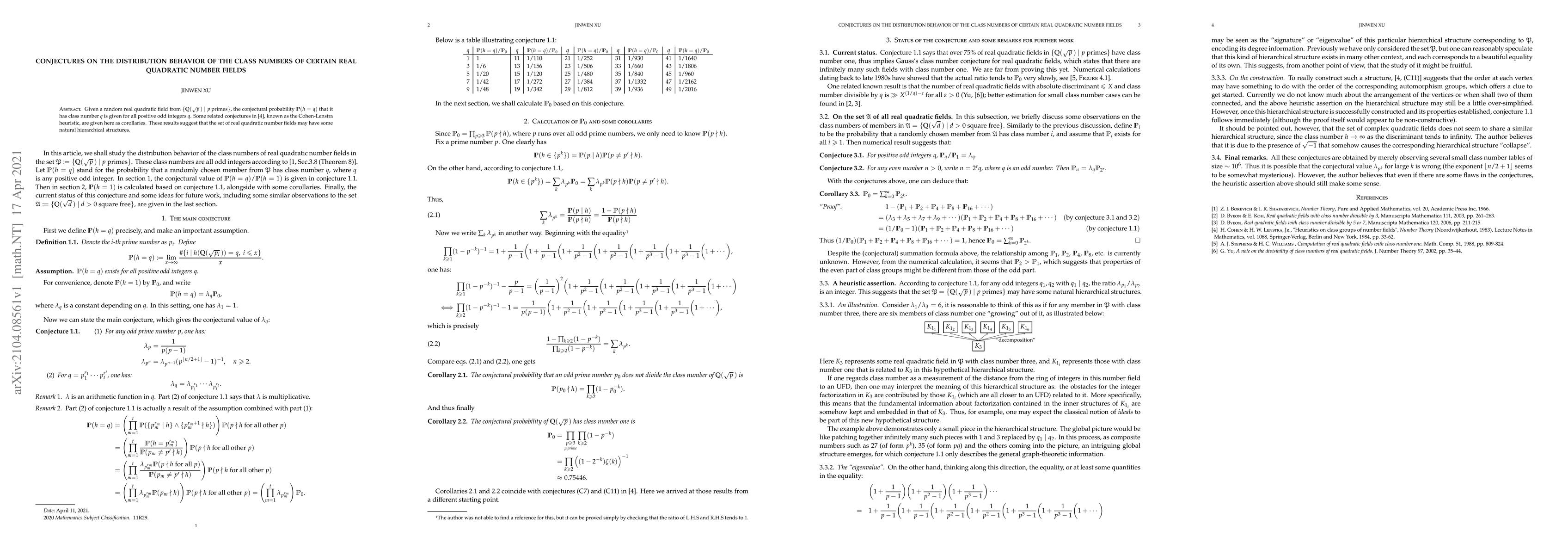 Given a random real quadratic field from $\{ \mathbb{Q}(\sqrt{p}\,) ~|~ p \text{ primes} \}$, the conjectural probability $\mathbb{P}(h=q)$ that it has class number $q$ is given for all positive odd integers $q$. Some related conjectures of the Cohen-Lenstra heuristic are given here as corollaries. These results suggest that the set of real quadratic number fields may have some natural hierarchical structures.