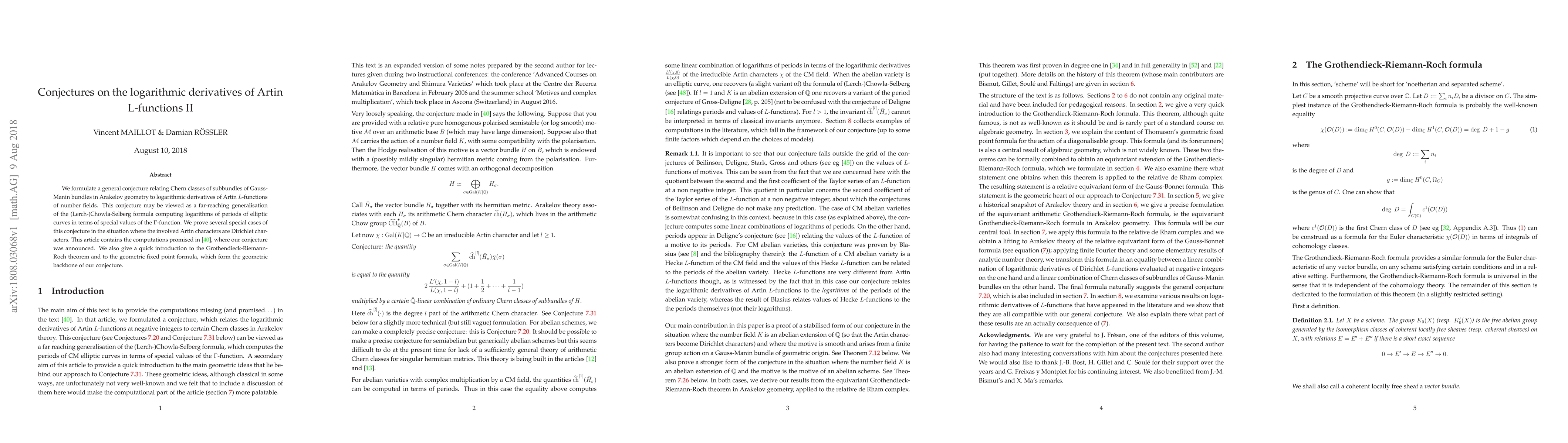 This paper formulates a conjecture linking Chern classes of subbundles in Arakelov geometry to logarithmic derivatives of Artin L-functions, generalizing the Chowla-Selberg formula. It proves special cases for Dirichlet characters and includes promised computations from a previous article.