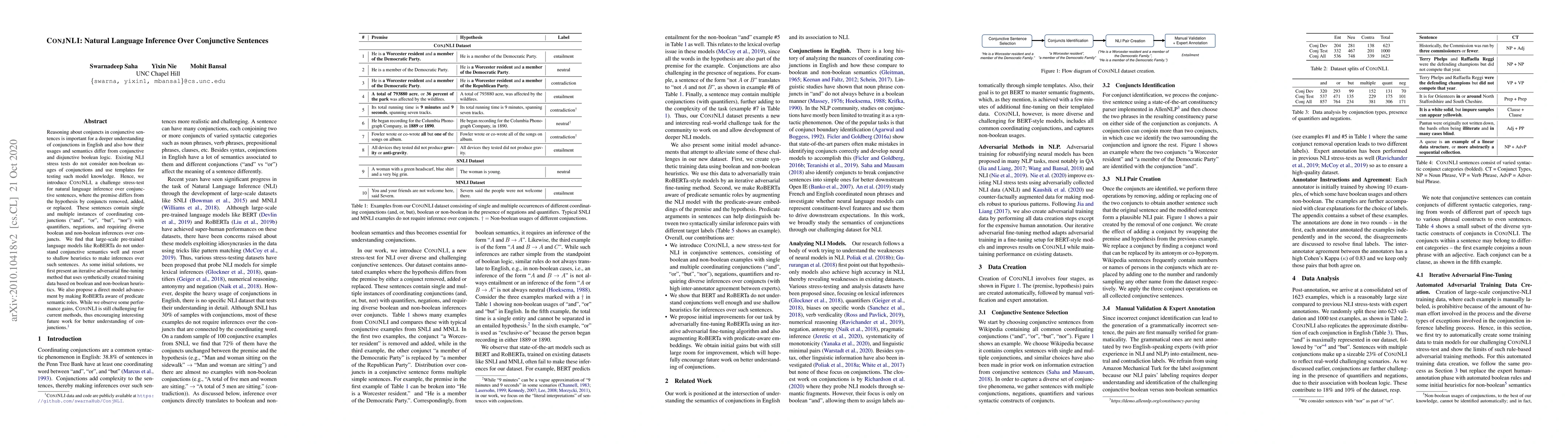The paper introduces ConjNLI, a challenge for natural language inference over conjunctive sentences, highlighting the limitations of current models in understanding non-boolean conjunctions. It proposes methods to improve inference, including iterative adversarial fine-tuning and enhancing RoBERTa with predicate semantic roles, though significant challenges remain.