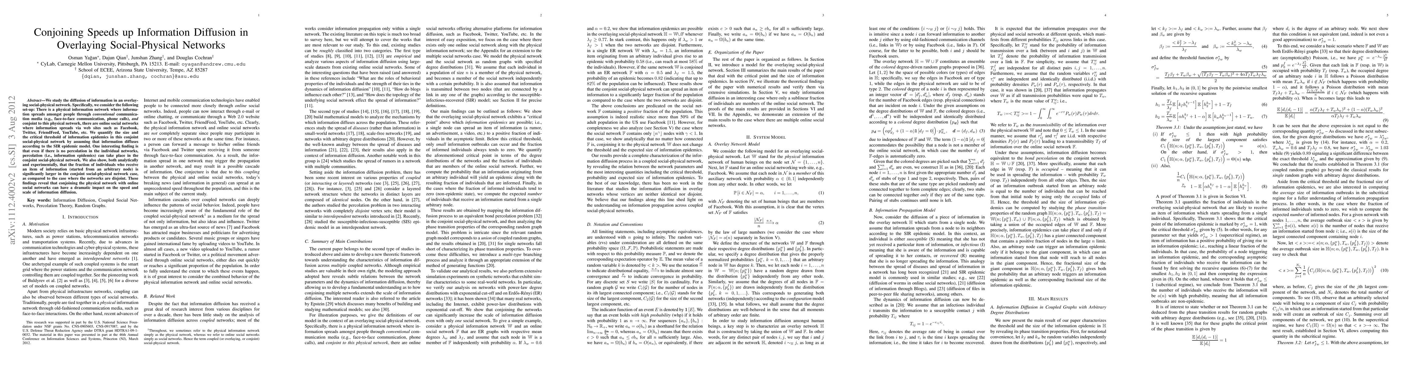 This research investigates how information diffusion is accelerated in overlaying social-physical networks, demonstrating that conjoining these networks significantly increases the fraction of individuals receiving information compared to disjoint networks. The study finds that even without percolation in individual networks, conjoining can lead to effective information epidemics.