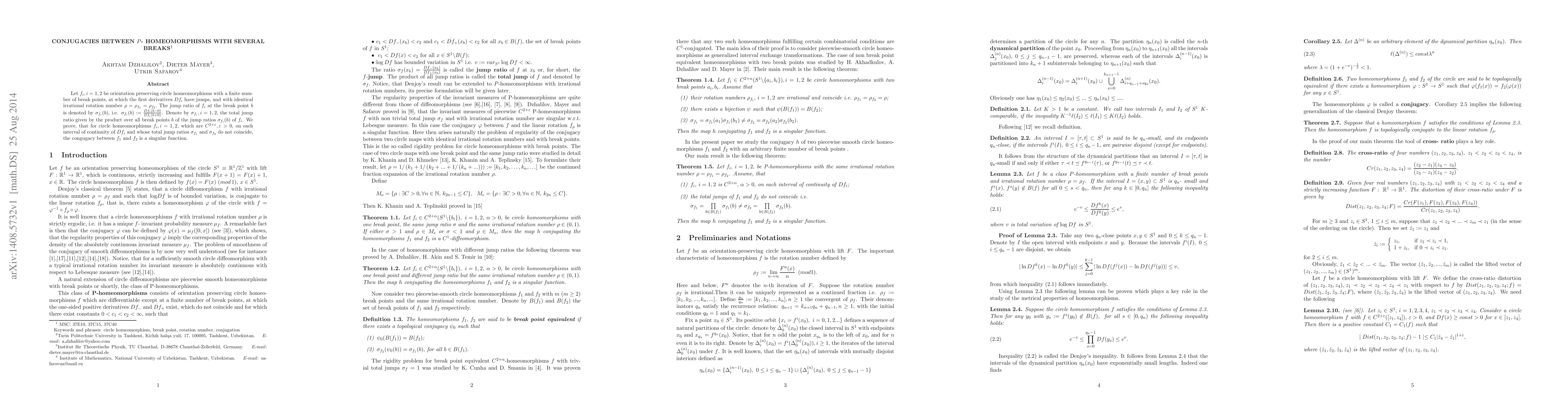 This paper proves that for $C^{2+\varepsilon}$ orientation-preserving circle homeomorphisms with identical irrational rotation numbers but differing total jump ratios, any conjugacy between them must be a singular function. The study focuses on homeomorphisms with finite break points where the first derivatives exhibit jumps.