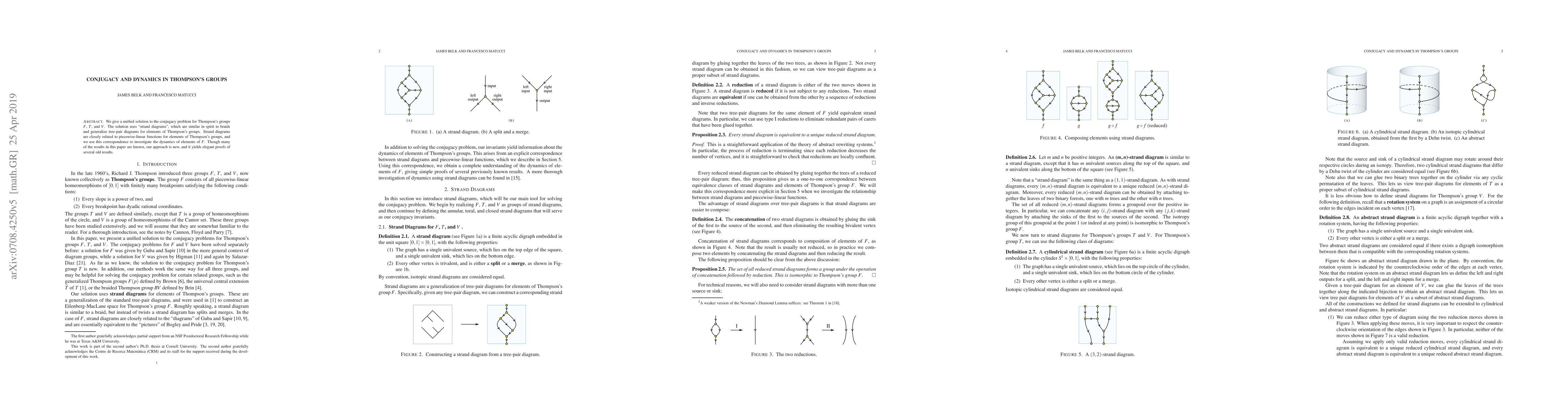 This paper presents a novel solution to the conjugacy problem for Thompson's groups F, T, and V using strand diagrams, which generalize tree-pair diagrams and relate to piecewise-linear functions, providing elegant proofs for known results and investigating the dynamics of elements in F.