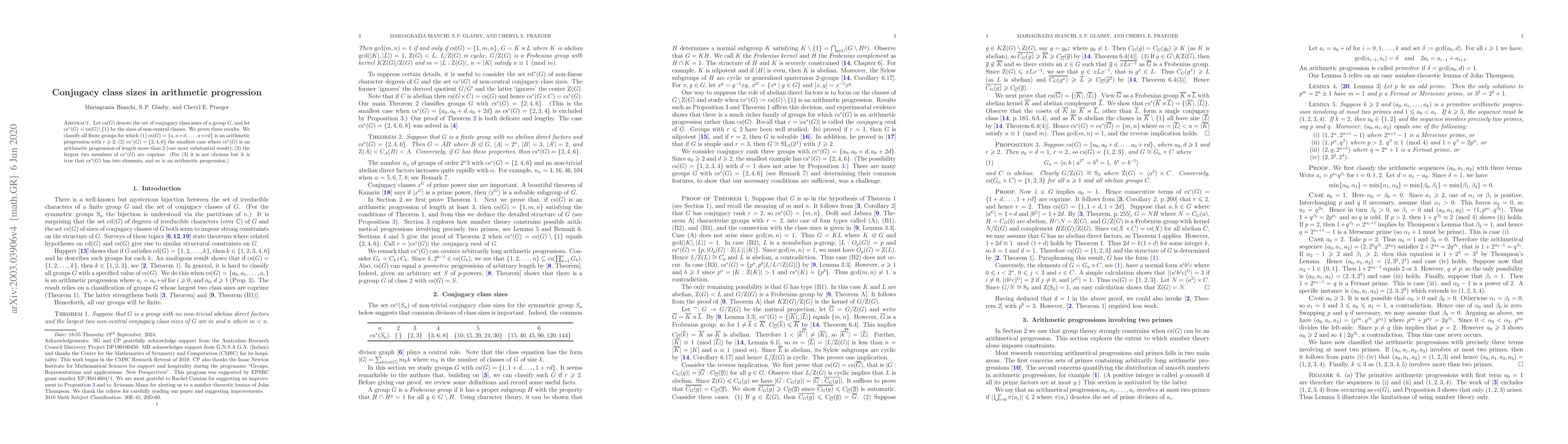Let ${\rm cs}(G)$ denote the set of conjugacy class sizes of a group $G$, and let ${\rm cs}^*(G)={\rm cs}(G)\setminus\{1\}$ be the sizes of non-central classes. We prove three results. We classify all finite groups $G$ with ${\rm cs}(G)=\{a, a+d, \dots ,a+rd\}$ an arithmetic progression with $r\geqslant 2$. (We show that ${\rm cs}(G)=\{1,2,3\}$.) Our most substantial result classifies all $G$ with ${\rm cs}^*(G)=\{2,4,6\}$. Finally, we classify all groups $G$ whose largest two non-central conjugacy class sizes are coprime. (Here it is not obvious but it is true that ${\rm cs}^*(G)$ has two elements, and so is an arithmetic progression.)