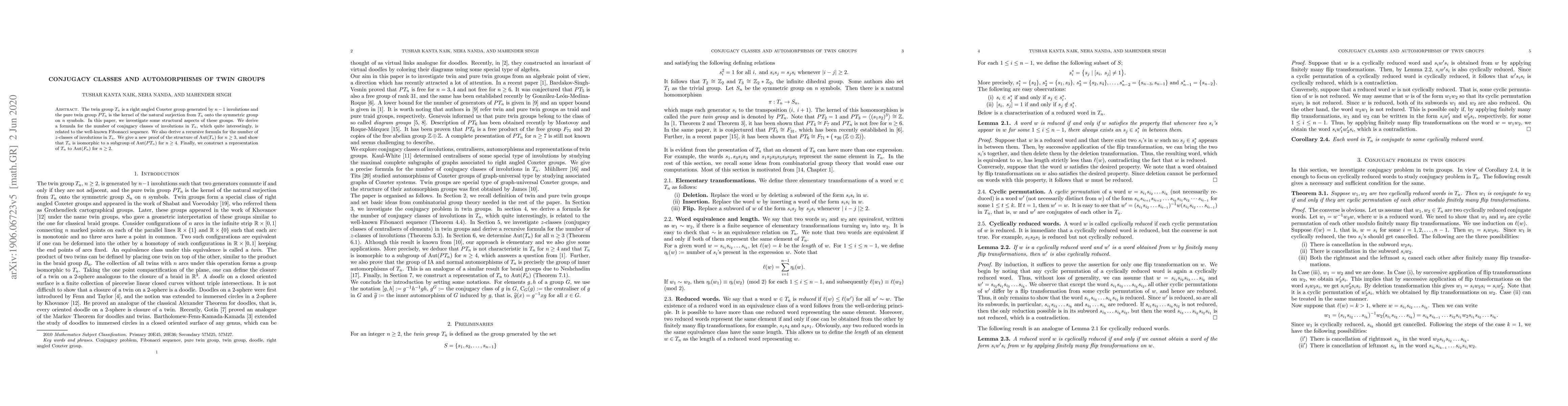 This paper explores the structural properties of twin groups $T_n$ and pure twin groups $PT_n$, deriving formulas for their conjugacy classes and automorphisms. It finds a Fibonacci sequence relation for involutions' conjugacy classes and constructs a representation linking $T_n$ to $\Aut(F_n)$.