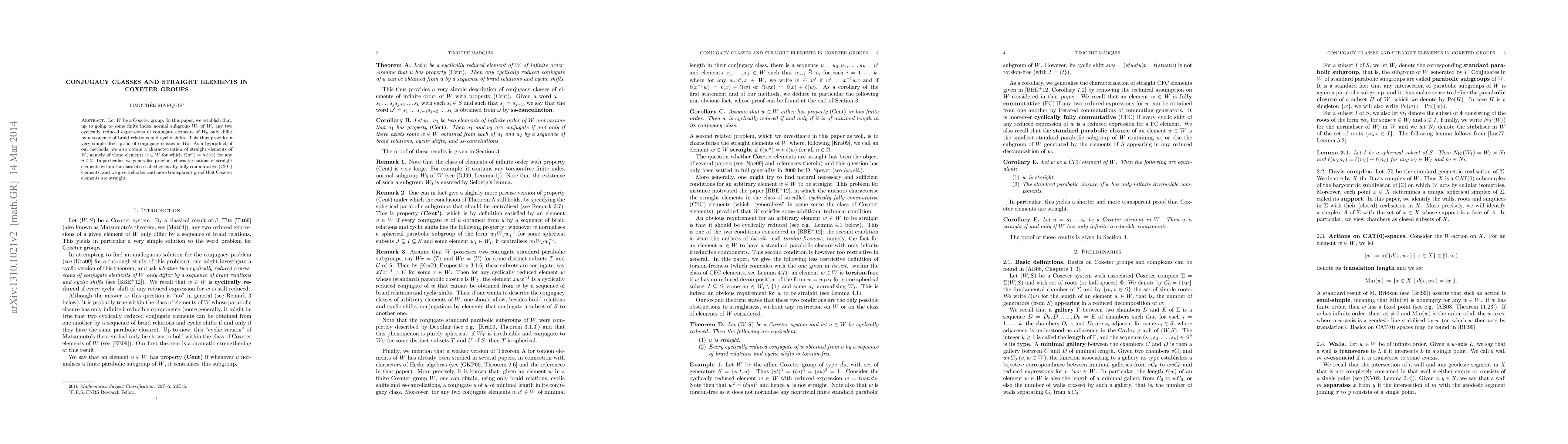 This paper establishes that in Coxeter groups W, conjugate elements in a finite index normal subgroup W_0 have cyclically reduced expressions differing only by braid relations and cyclic shifts. It also characterises straight elements in W, those with a specific relation between their powers and lengths, and provides a simpler proof for Coxeter elements being straight.