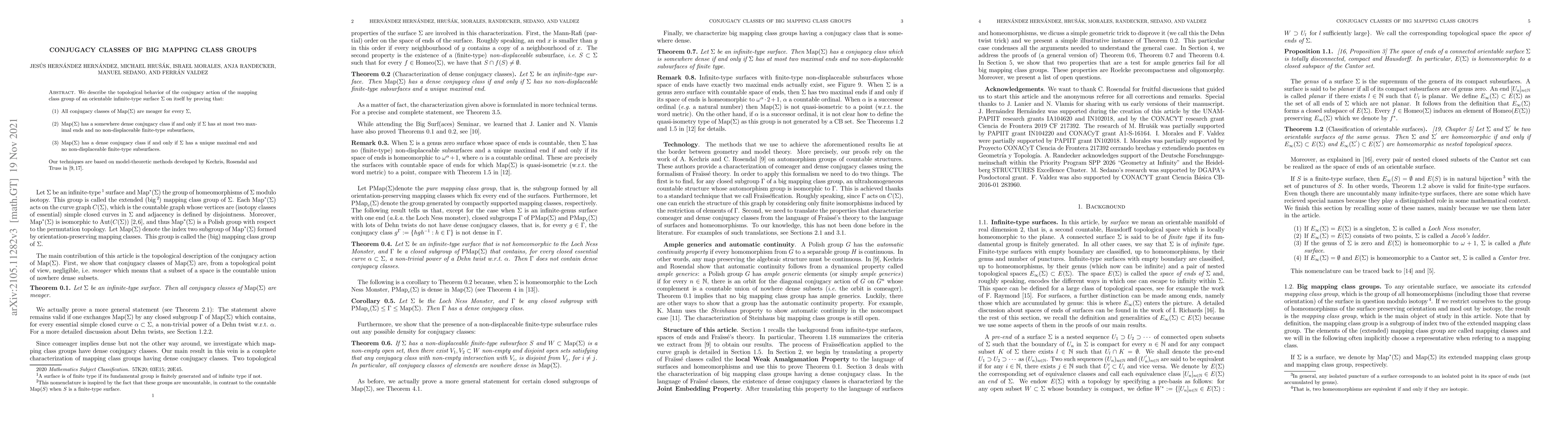 This paper explores the conjugacy classes within the mapping class group of infinite-type surfaces, proving that all conjugacy classes are meager. It also establishes conditions under which conjugacy classes are somewhere dense or dense, relying on the surface's end structure and the absence of certain subsurfaces. Techniques from model theory are employed to achieve these results.