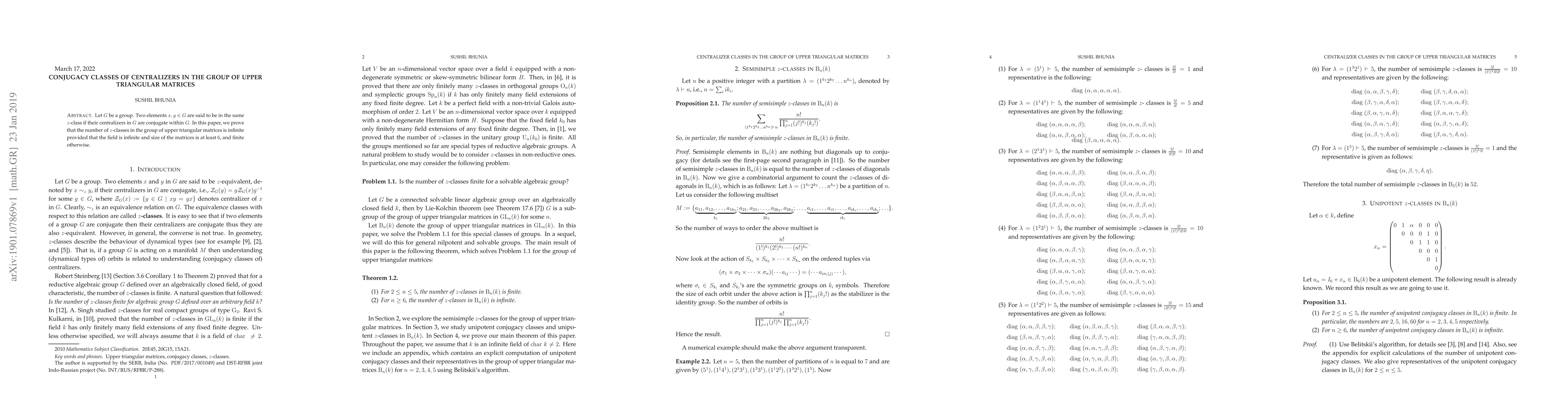 The paper presents a detailed proof and classification of conjugacy classes of centralizers in upper triangular matrix groups, extending previous results for n=12 and n=6 to all n≥6.
