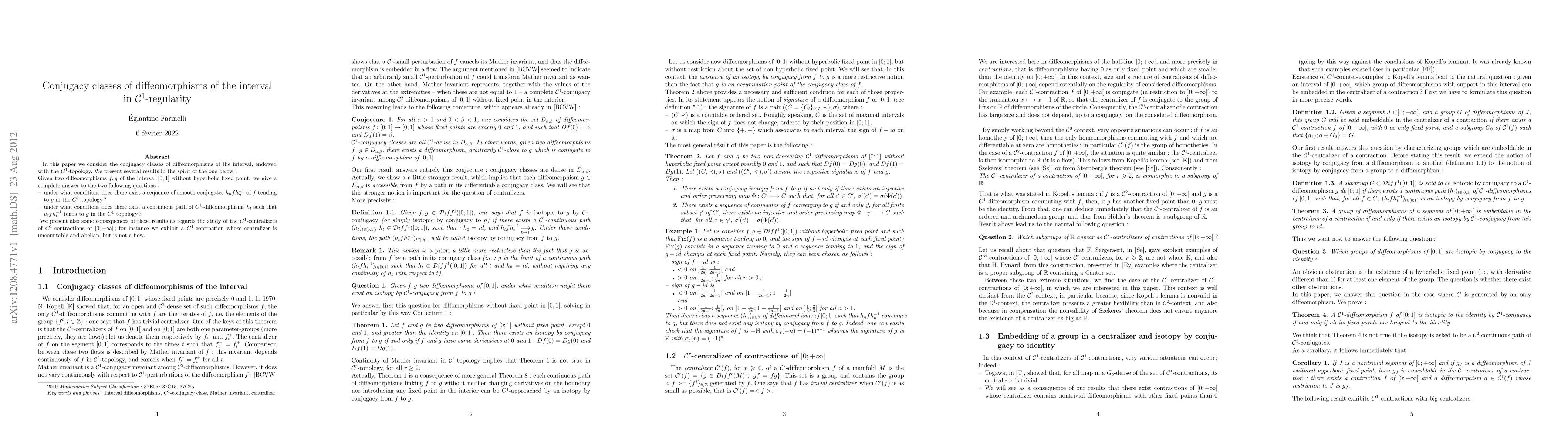 In this paper we consider the conjugacy classes of diffeomorphisms of the interval, endowed with the $C^1$-topology. We present several results in the spirit of the one below : Given two diffeomorphisms $f,g$ of the interval $[0;1]$ without hyperbolic fixed point, we give a complete answer to the two following questions: - under what conditions does there exist a sequence of smooth conjugates $h_n f h_n^{-1}$ of $f$ tending to $g$ in the $C^1$-topology ? - under what conditions does there exist a continuous path of $C^1$-diffeomorphisms $h_t$ such that $h_t f h_t^{-1}$ tends to $g$ in the $C^1$ topology ? We present also some consequences of these results as regards the study of the $C^1$-centralizers of $C^1$-contractions of $[0;+\infty[$ ; for instance we exhibit a $C^1$-contraction whose centralizer is uncountable and abelian, but is not a flow.