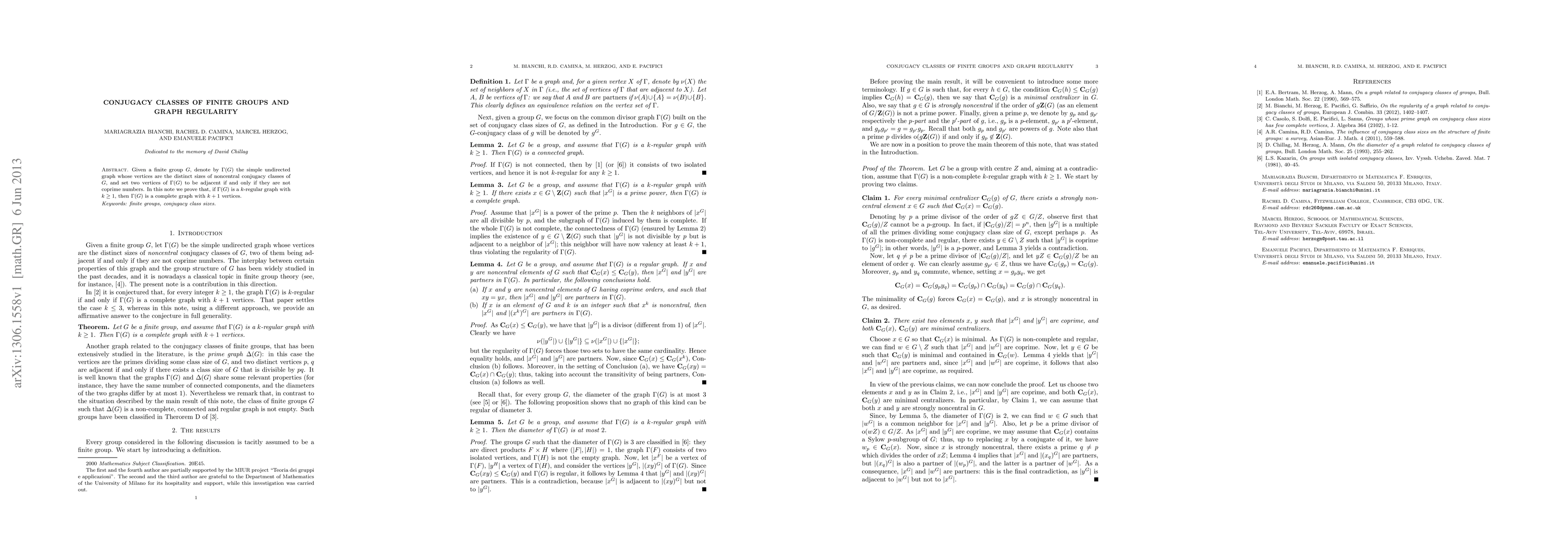 Given a finite group $G$, denote by $\Gamma(G)$ the simple undirected graph whose vertices are the distinct sizes of noncentral conjugacy classes of $G$, and set two vertices of $\Gamma(G)$ to be adjacent if and only if they are not coprime numbers. In this note we prove that, if $\Gamma(G)$ is a $k$-regular graph with $k\geq 1$, then $\Gamma(G)$ is a complete graph with $k+1$ vertices.