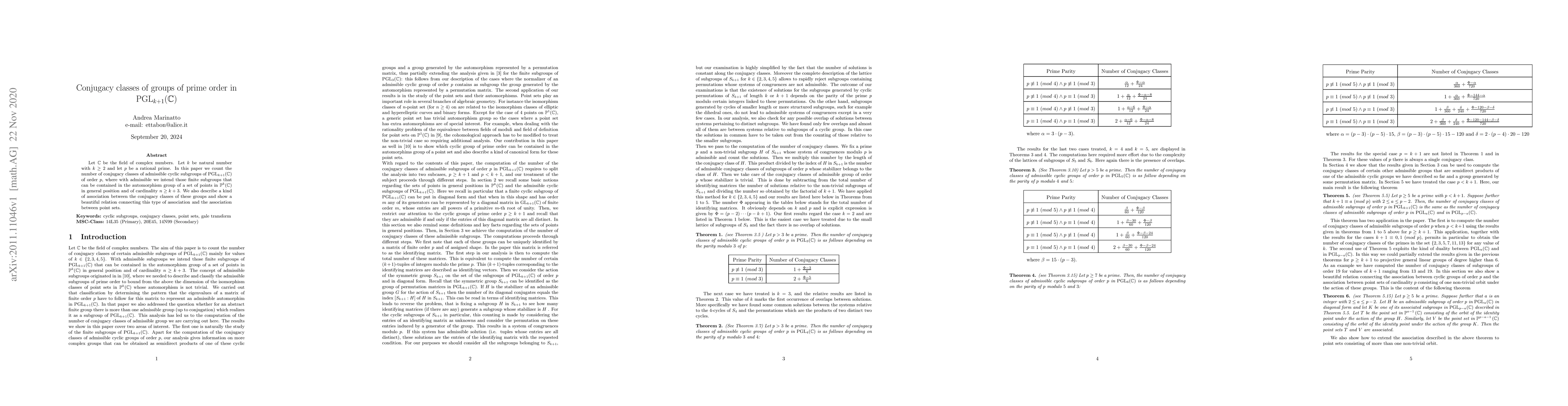 This paper counts the conjugacy classes of cyclic subgroups of prime order $p$ in $\mathrm{PGL}_{k+1}(\mathbb{C})$, focusing on those contained in the automorphism group of general point sets in $\mathbb{P}^k(\mathbb{C})$. It also reveals a relation linking these conjugacy classes to associations between point sets.