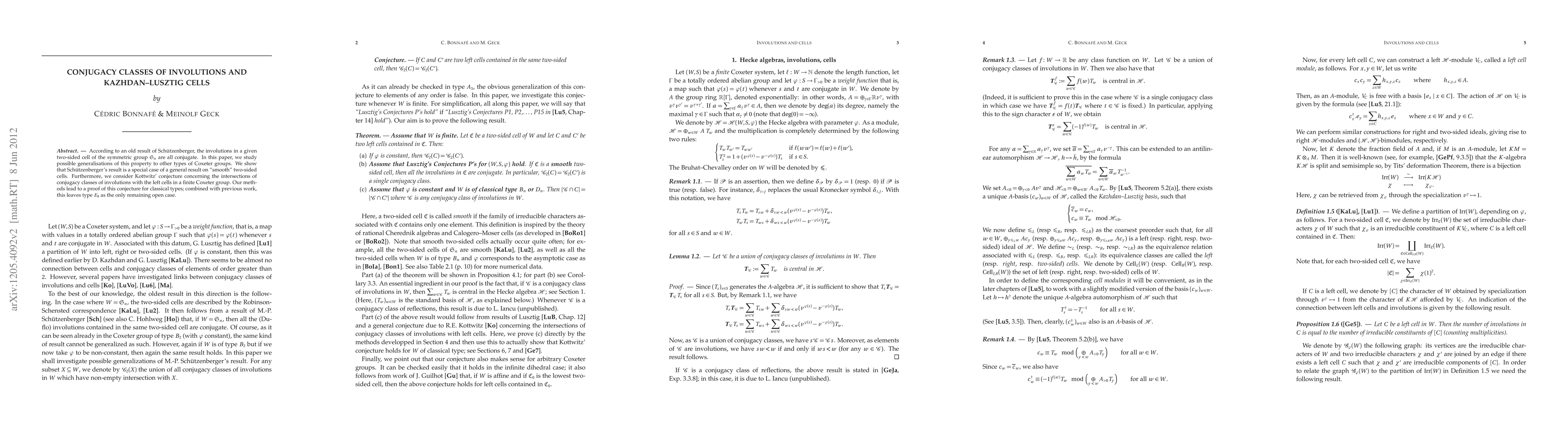 This paper generalizes Sch\"utzenberger's result on involutions in symmetric groups to Coxeter groups, showing that involutions in "smooth" two-sided cells are conjugate. It also proves Kottwitz's conjecture on the intersections of involution conjugacy classes with left cells in finite Coxeter groups for classical types, leaving type $E_8$ as the sole unresolved case.