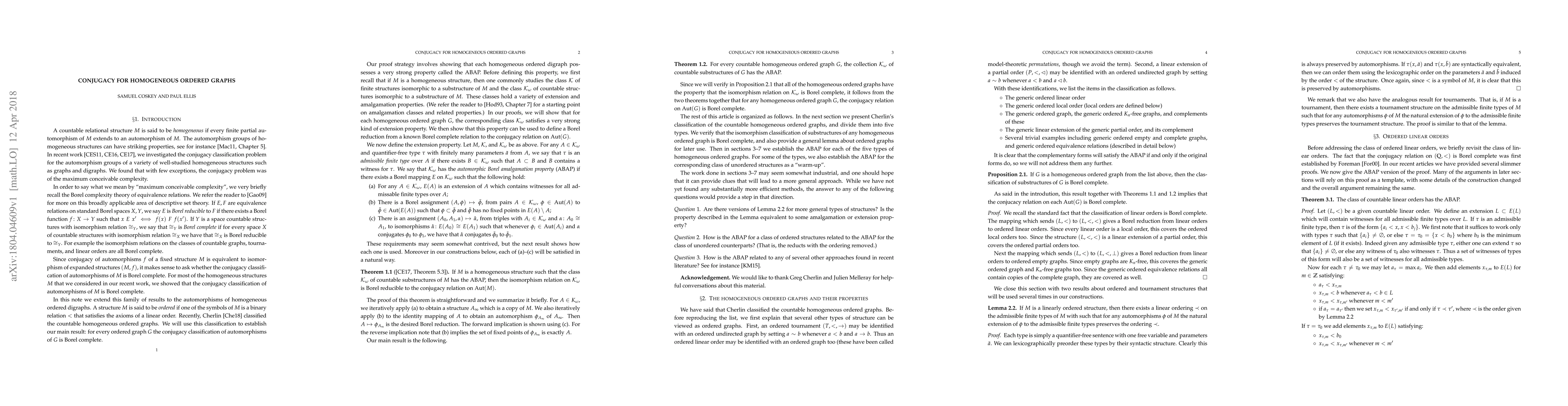 This paper demonstrates that the conjugacy problem for automorphisms of any countable homogeneous ordered graph $G$ is Borel complete. It also proves that $G$ possesses the ABAP property, which ensures the isomorphism relation on substructures of $G$ is Borel reducible to the conjugacy relation on automorphisms of $G$.