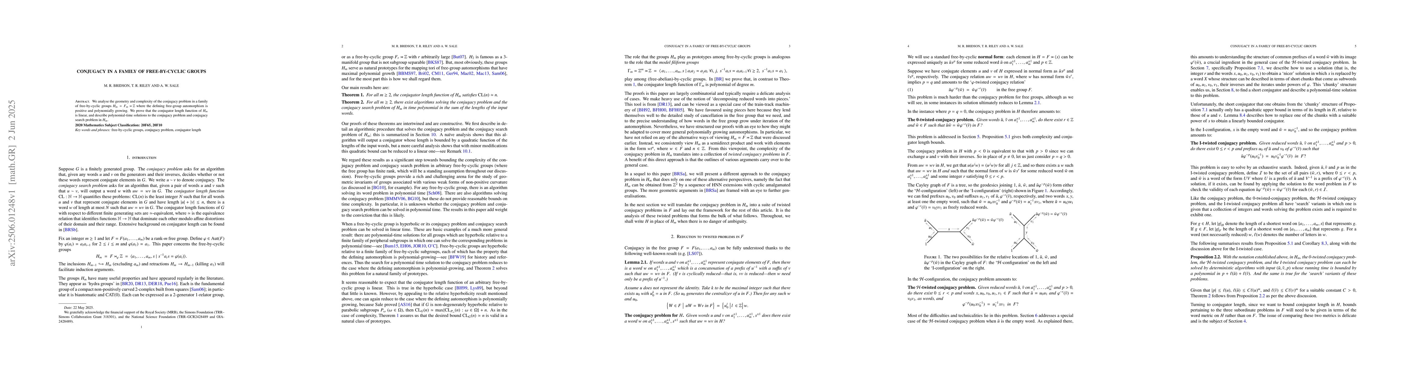 We analyse the geometry and complexity of the conjugacy problem in a family of free-by-cyclic groups $H_m=F_m\rtimes\mathbb{Z}$ where the defining free-group automorphism is positive and polynomially growing. We prove that the conjugator length function of $H_m$ is linear, and describe polynomial-time solutions to the conjugacy problem and conjugacy search problem in $H_m$.