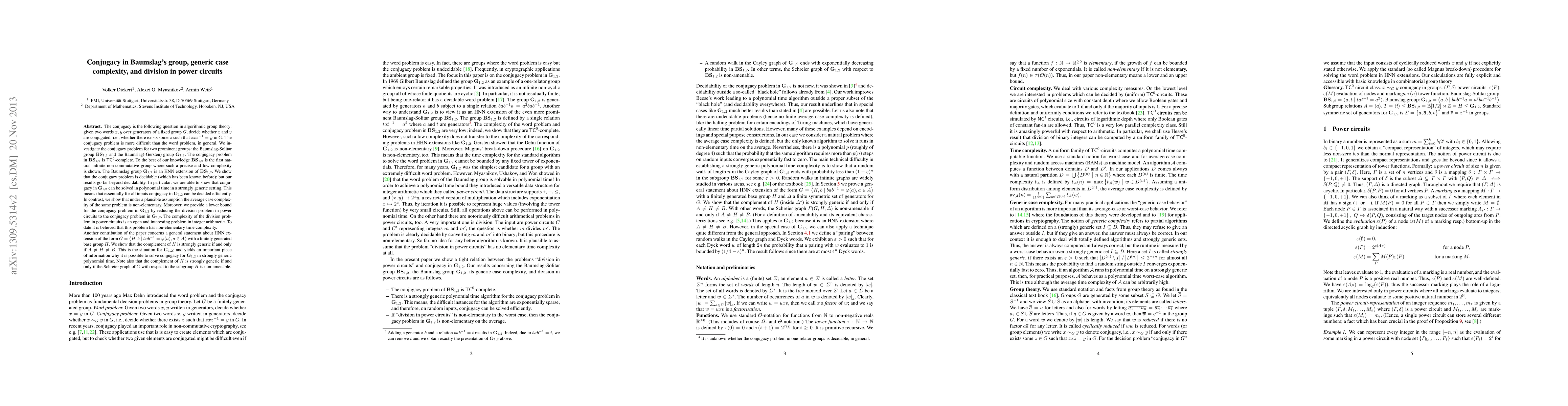 This paper explores the complexity of the conjugacy problem in two specific groups: Baumslag-Solitar group BS(1,2) and Baumslag group G(1,2). The conjugacy problem in BS(1,2) is shown to be TC^0-complete, marking it as a notable natural infinite non-commutative group with such low complexity. For G(1,2), the paper demonstrates polynomial-time solvability in a strongly generic setting, while highlighting non-elementary average case complexity and reducing the division problem in power circuits to the conjugacy problem in G(1,2).