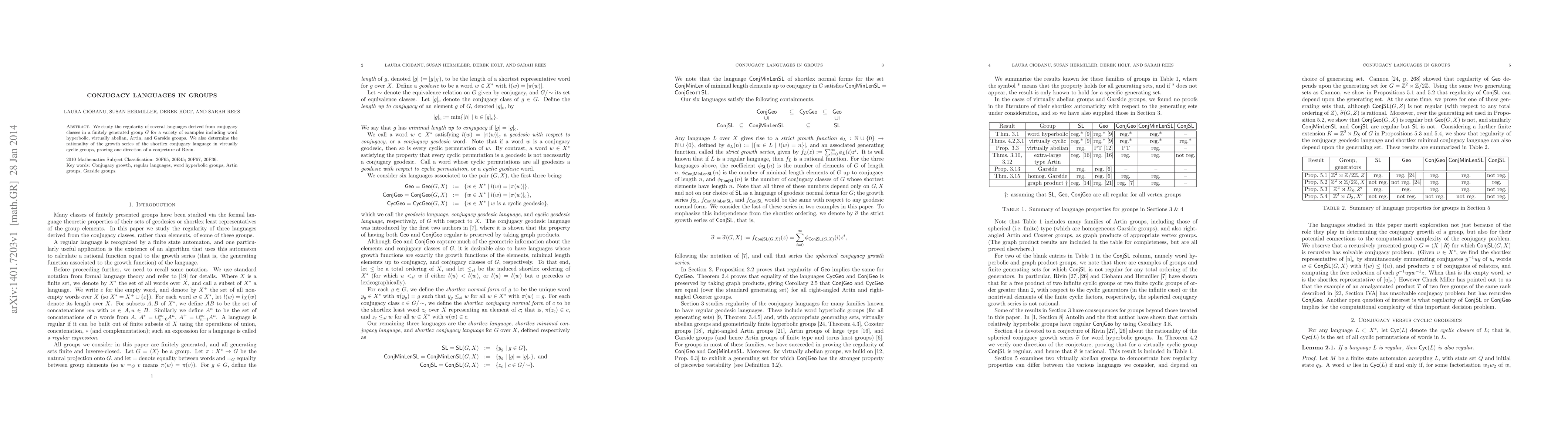 We study the regularity of several languages derived from conjugacy classes in a finitely generated group G for a variety of examples including word hyperbolic, virtually abelian, Artin, and Garside groups. We also determine the rationality of the growth series of the shortlex conjugacy language in virtually cyclic groups, proving one direction of a conjecture of Rivin.