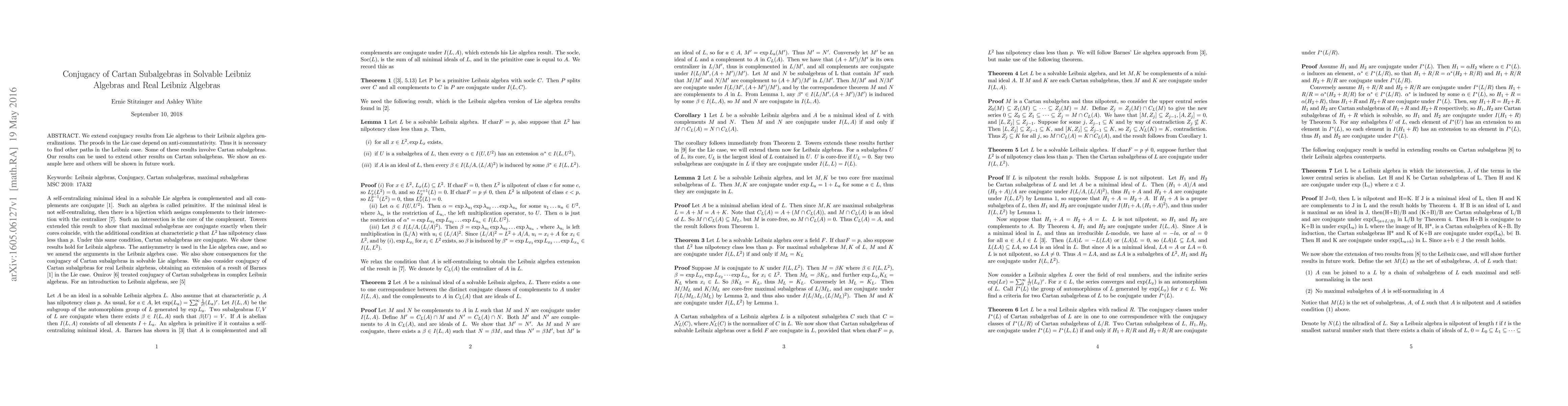 Summary: This paper extends conjugacy results from Lie algebras to Leibniz algebras, finding alternative methods to account for the lack of anti-commutativity in Leibniz algebras. It demonstrates the applicability of these methods to Cartan subalgebras, with future work promising further examples of extended results.