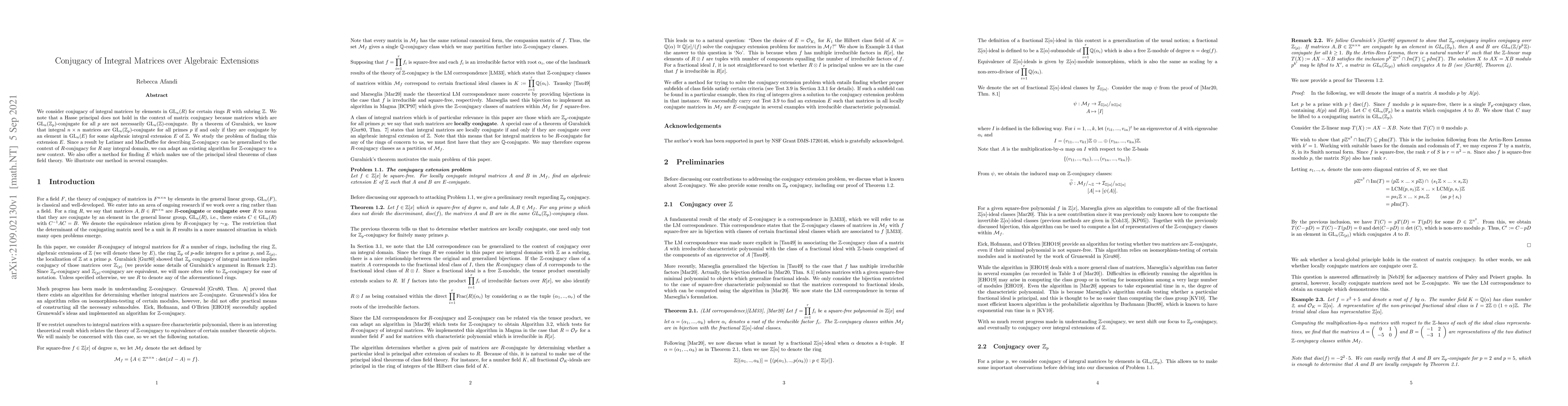 This paper investigates the conjugacy of integral matrices over algebraic extensions, showing that matrices conjugate over $\text{GL}_{n}(\mathbb{Z}_p)$ for all primes $p$ are not necessarily $\text{GL}_{n}(\mathbb{Z})$-conjugate. It proposes a method to find algebraic extensions $E$ that ensure conjugacy, utilizing class field theory and adapting existing algorithms for $\mathbb{Z}$-conjugacy.