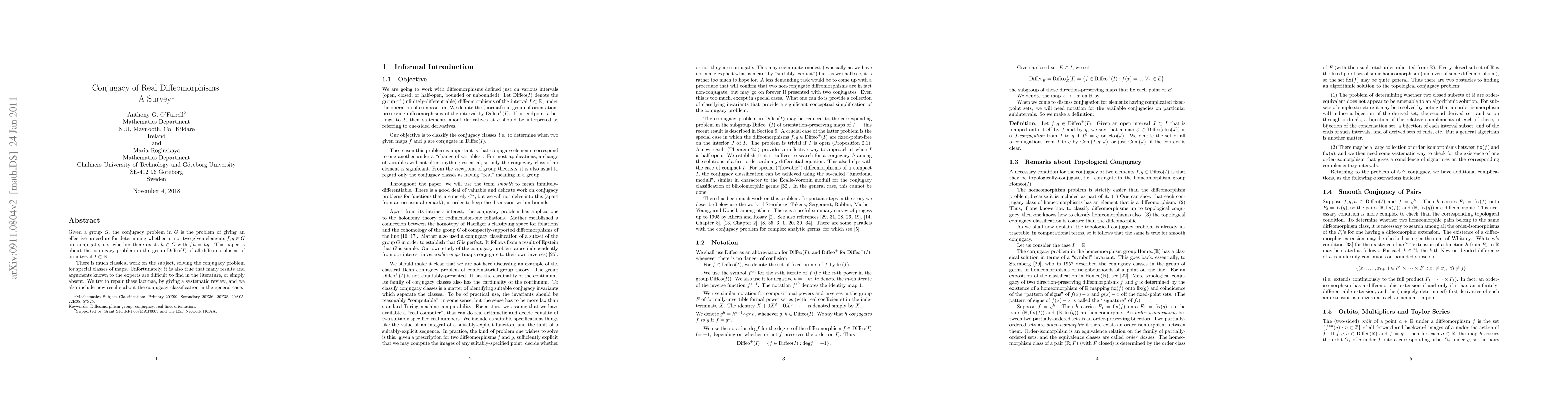 Given a group G, the conjugacy problem in G is the problem of giving an effective procedure for determining whether or not two given elements f, g of G are conjugate, i.e. whether there exists h belonging to G with fh = hg. This paper is about the conjugacy problem in the group Diffeo(I) of all diffeomorphisms of an interval I in R. There is much classical work on the subject, solving the conjugacy problem for special classes of maps. Unfortunately, it is also true that many results and arguments known to the experts are difficult to find in the literature, or simply absent. We try to repair these lacunae, by giving a systematic review, and we also include new results about the conjugacy classification in the general case.