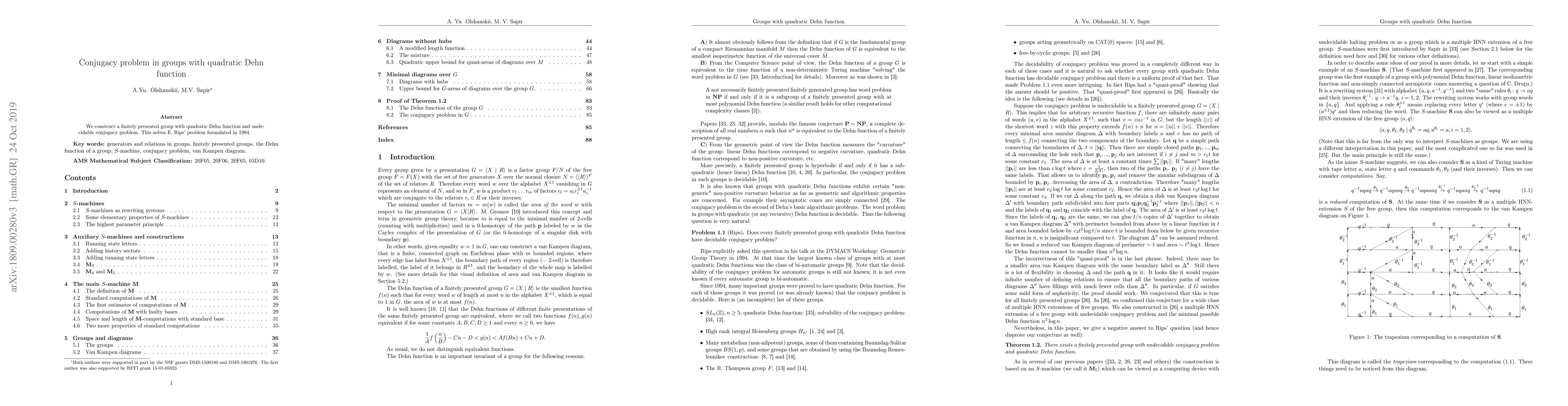 Researchers have solved E. Rips' 1992 problem of finding a finitely presented group with an undecidable conjugacy problem, creating a group with a quadratic Dehn function.