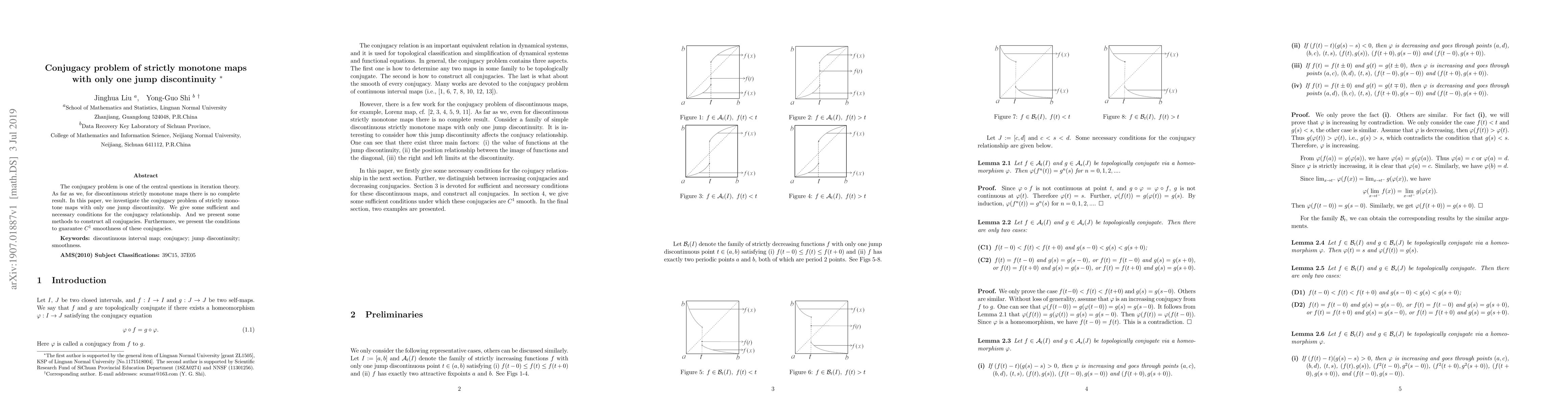 The conjugacy problem is one of the central questions in iteration theory. As far as we, for discontinuous strictly monotone maps there is no complete result. In this paper, we investigate the conjugacy problem of strictly monotone maps with only one jump discontinuity. We give some sufficient and necessary conditions for the conjugacy relationship. And we present some methods to construct all conjugacies. Furthermore, we present the conditions to guarantee $C^1$ smoothness of these conjugacies.