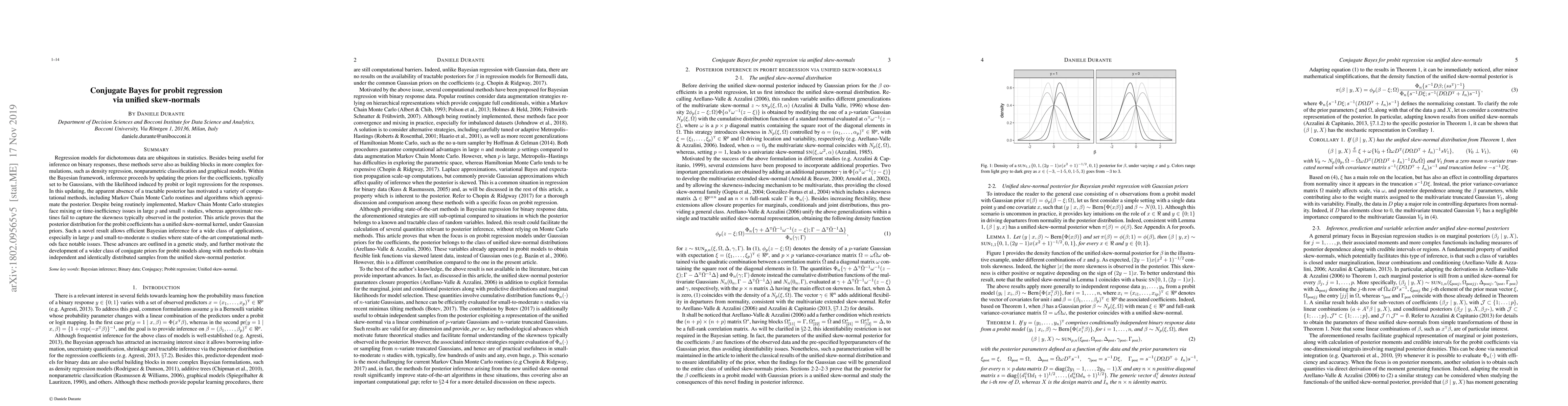This paper introduces a novel conjugate Bayesian approach for probit regression using unified skew-normal distributions, addressing computational inefficiencies in large-scale studies. It demonstrates that the posterior distribution for probit coefficients has a unified skew-normal kernel, enabling efficient inference and overcoming limitations of existing MCMC and approximation methods.