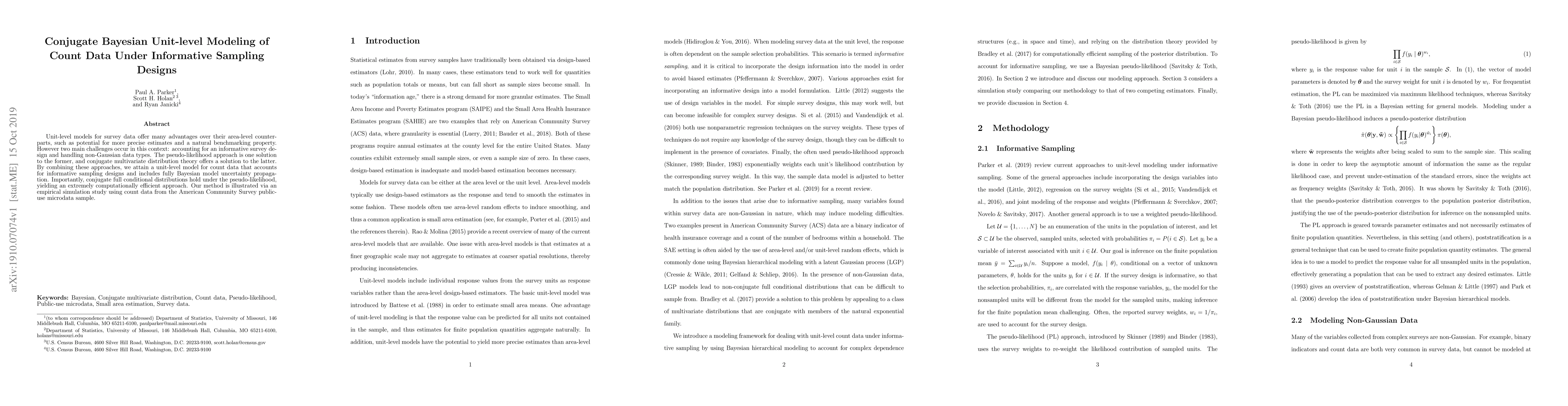 This paper proposes a unit-level Bayesian model for count data under informative sampling designs, combining pseudo-likelihood for design adjustment and conjugate multivariate distributions for non-Gaussian data. The method efficiently propagates model uncertainty and is demonstrated via a simulation study using American Community Survey data.