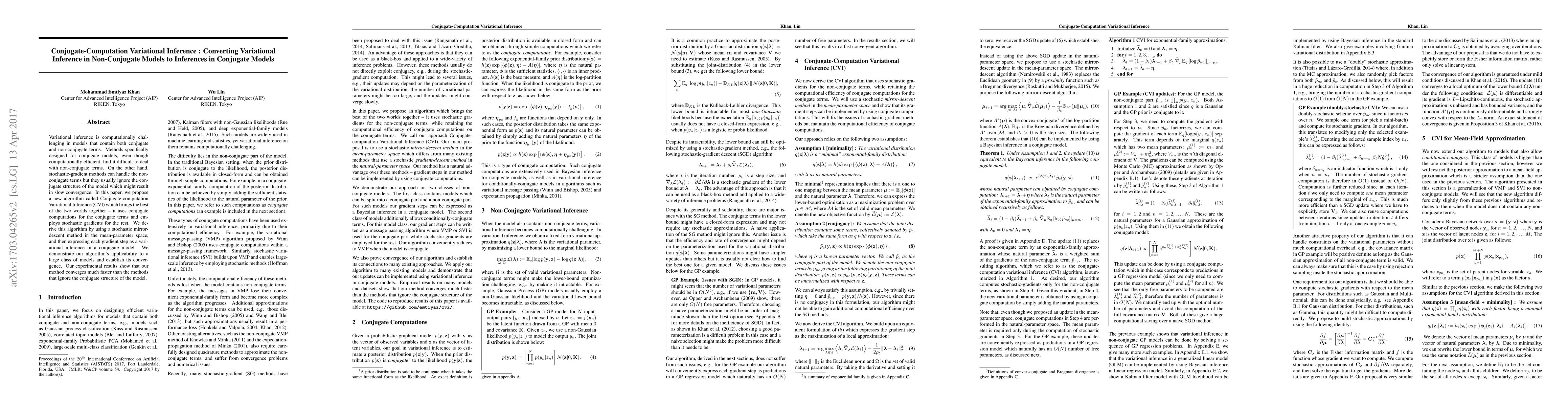 This paper proposes a Conjugate-computation Variational Inference (CVI) algorithm that efficiently handles both conjugate and non-conjugate terms in variational inference by leveraging conjugate computations and stochastic gradients, demonstrating faster convergence compared to existing methods.
