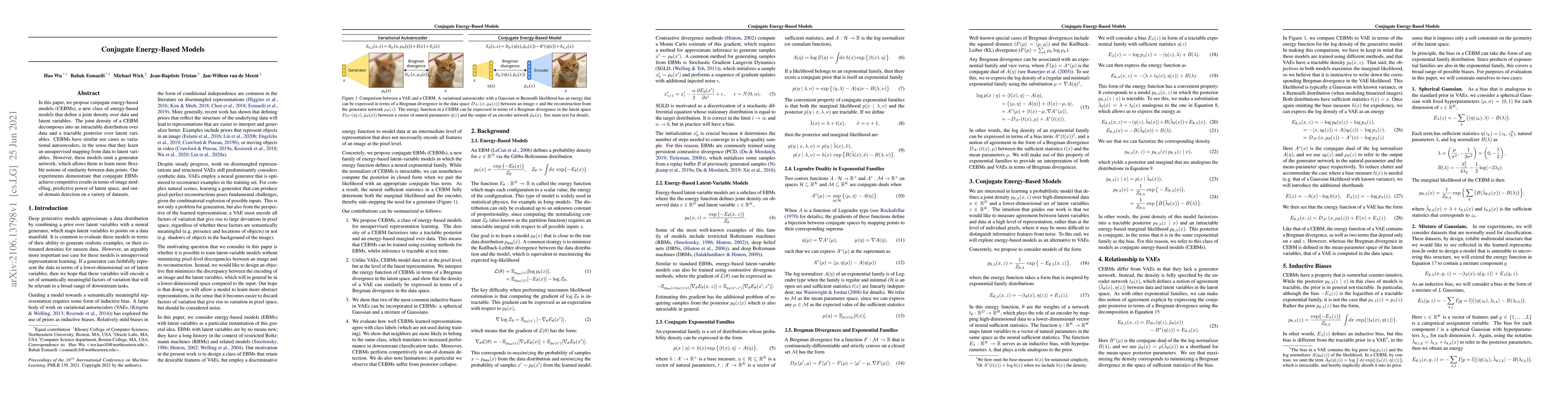 In this paper, we propose conjugate energy-based models (CEBMs), a new class of energy-based models that define a joint density over data and latent variables. The joint density of a CEBM decomposes into an intractable distribution over data and a tractable posterior over latent variables. CEBMs have similar use cases as variational autoencoders, in the sense that they learn an unsupervised mapping from data to latent variables. However, these models omit a generator network, which allows them to learn more flexible notions of similarity between data points. Our experiments demonstrate that conjugate EBMs achieve competitive results in terms of image modelling, predictive power of latent space, and out-of-domain detection on a variety of datasets.