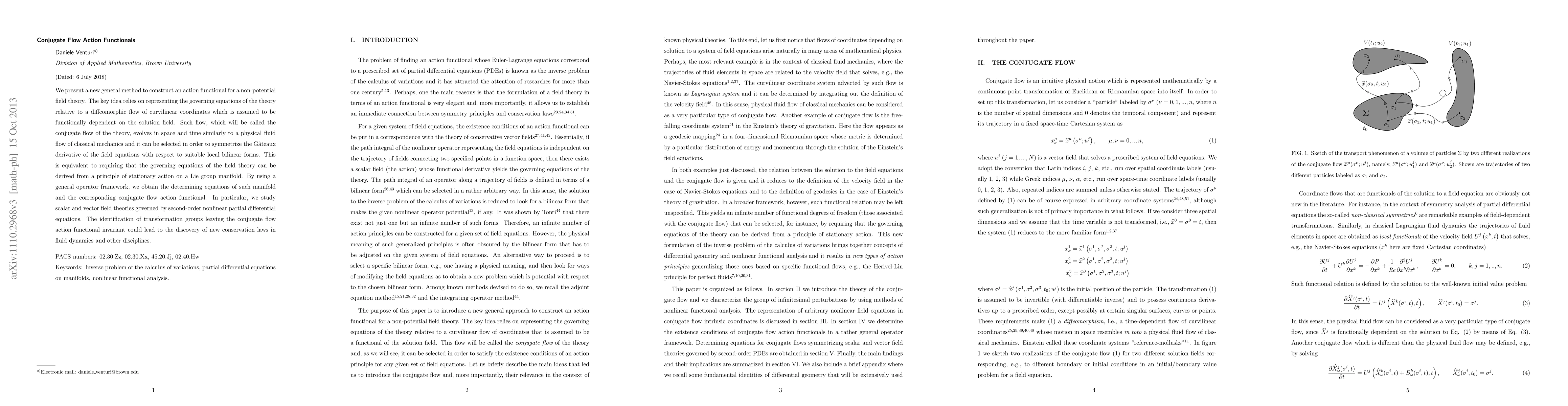 We present a new general method to construct an action functional for a non-potential field theory. The key idea relies on representing the governing equations of the theory relative to a diffeomorphic flow of curvilinear coordinates which is assumed to be functionally dependent on the solution field. Such flow, which will be called the conjugate flow of the theory, evolves in space and time similarly to a physical fluid flow of classical mechanics and it can be selected in order to symmetrize the Gateaux derivative of the field equations with respect to suitable local bilinear forms. This is equivalent to requiring that the governing equations of the field theory can be derived from a principle of stationary action on a Lie group manifold. By using a general operator framework, we obtain the determining equations of such manifold and the corresponding conjugate flow action functional. In particular, we study scalar and vector field theories governed by second-order nonlinear partial differential equations. The identification of transformation groups leaving the conjugate flow action functional invariant could lead to the discovery of new conservation laws in fluid dynamics and other disciplines.