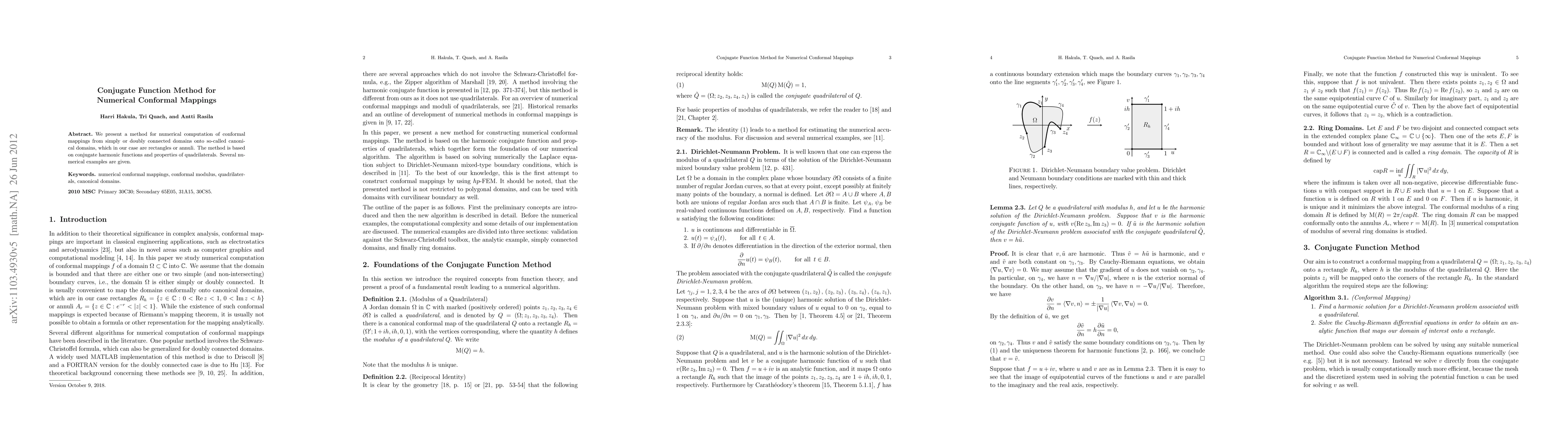 This paper introduces a novel method using conjugate harmonic functions and quadrilateral properties to numerically compute conformal mappings of simply or doubly connected domains onto canonical rectangles or annuli, illustrated with several numerical examples.