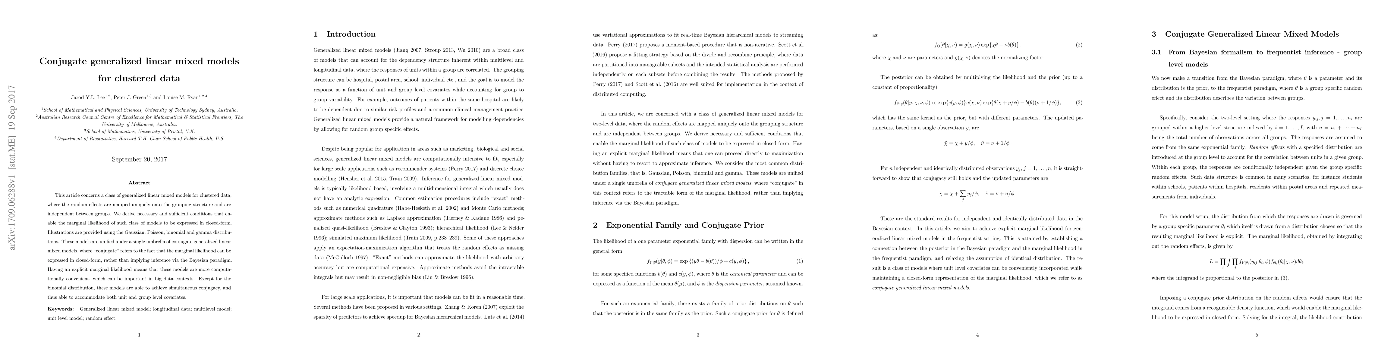 This paper develops a class of conjugate generalized linear mixed models for clustered data, deriving conditions for closed-form marginal likelihoods. These models are computationally efficient and can accommodate both unit and group level covariates, except for binomial distributions.