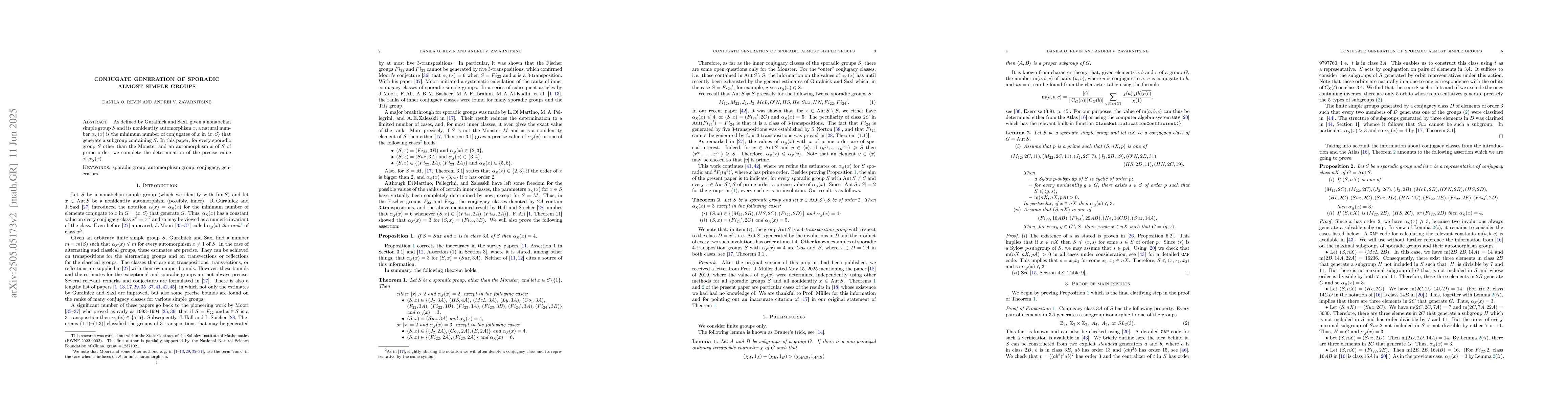 As defined by Guralnick and Saxl, given a nonabelian simple group $S$ and its nonidentity automorphism $x$, a natural number $\alpha_S(x)$ is the minimum number of conjugates of $x$ in $\langle x,S\rangle$ that generate a subgroup containing $S$. In this paper, for every sporadic group $S$ other than the Monster and an automorphism $x$ of $S$ of prime order, we complete the determination of the precise value of $\alpha_S(x)$.