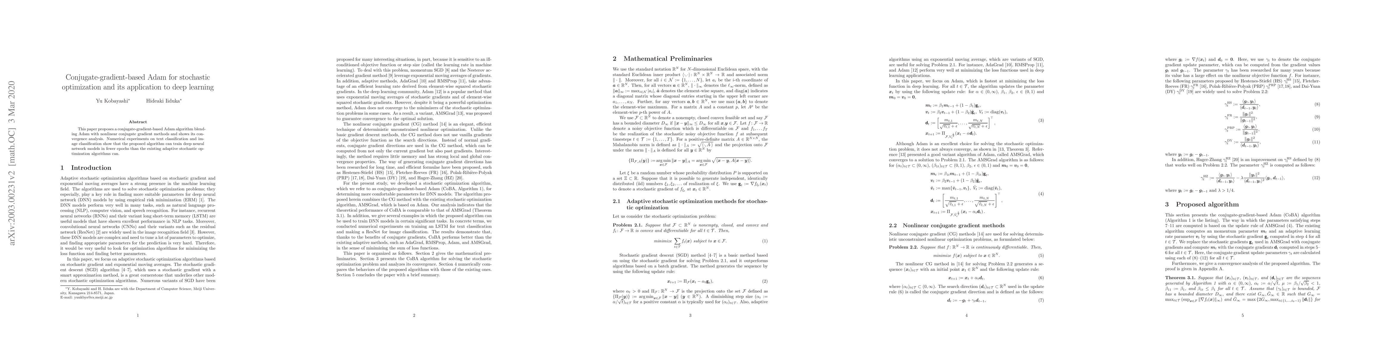 This paper introduces a conjugate-gradient-based Adam algorithm that combines Adam with nonlinear conjugate gradient methods, demonstrating its convergence. Experiments reveal that it trains deep neural networks faster than existing adaptive stochastic optimization algorithms in text and image classification tasks.
