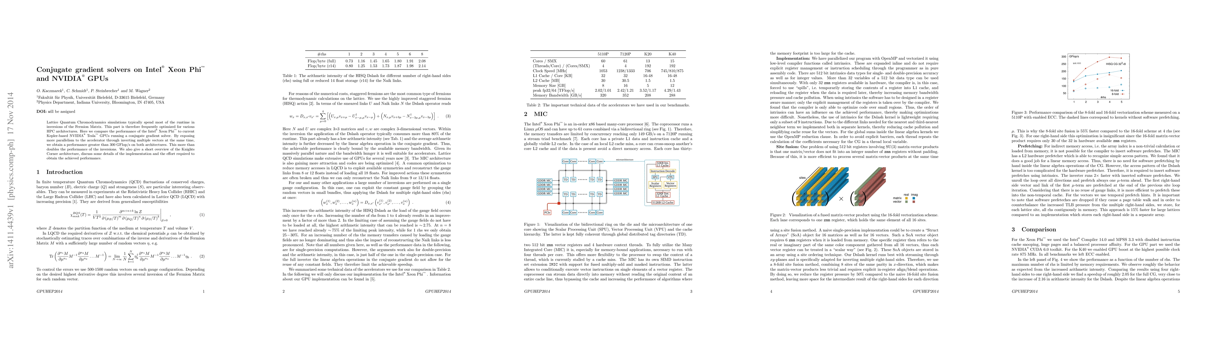 This paper compares the performance of Intel Xeon Phi and Kepler-based NVIDIA Tesla GPUs for conjugate gradient solvers in Lattice Quantum Chromodynamics simulations, achieving over 300 GFlop/s by parallelizing matrix inversions, and provides insights into the Knights Corner architecture.