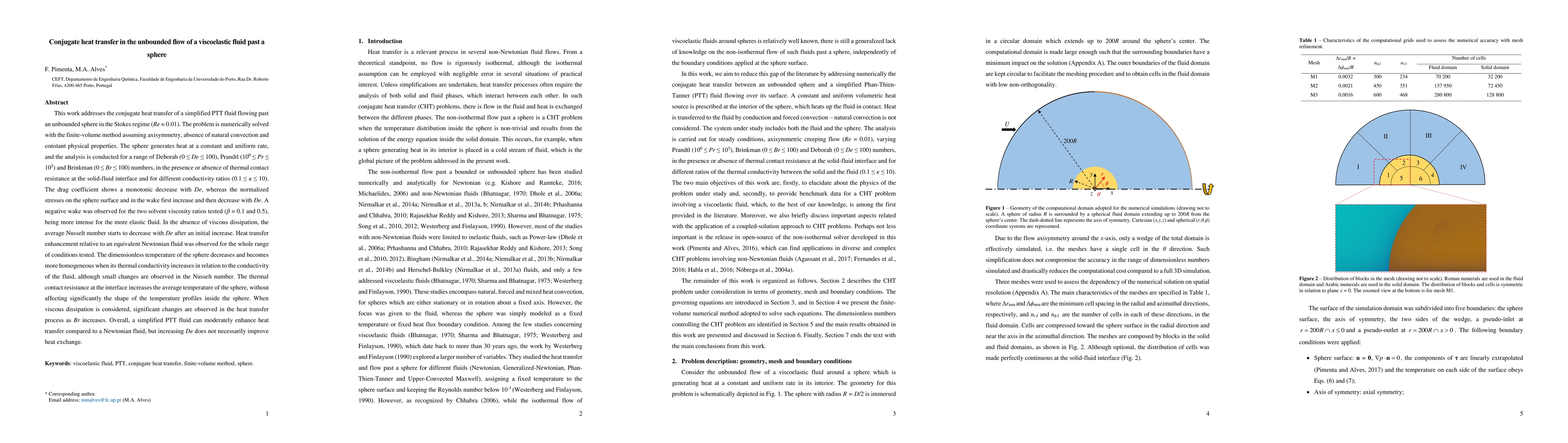 This work addresses the conjugate heat transfer of a simplified PTT fluid flowing past an unbounded sphere in the Stokes regime ($Re = 0.01$). The problem is numerically solved with the finite-volume method assuming axial symmetry, absence of natural convection and constant physical properties. The sphere generates heat at a constant and uniform rate, and the analysis is conducted for a range of Deborah ($0 \leq De \leq 100$), Prandtl ($10^0 \leq Pr \leq 10^5$), Brinkman ($0 \leq Br \leq 100$) and conductivity ratios ($0.1 \leq \kappa \leq 10$), in the presence or absence of thermal contact resistance at the solid-fluid interface. The drag coefficient shows a monotonic decrease with $De$, whereas the stresses on the sphere surface and in the wake first increase and then decrease with $De$. A negative wake was observed for the two solvent viscosity ratios tested ($\beta$ = 0.1 and 0.5), being more intense for the more elastic fluid. In the absence of viscous dissipation, the average Nusselt number starts to decrease with $De$ after an initial increase. Heat transfer enhancement relative to an equivalent Newtonian fluid was observed for the whole range of conditions tested. The temperature of the sphere decreases and becomes more homogeneous when its thermal conductivity increases in relation to the conductivity of the fluid, although small changes are observed in the Nusselt number. The thermal contact resistance at the interface increases the average temperature of the sphere, without affecting significantly the shape of the temperature profiles inside the sphere. When viscous dissipation is considered, significant changes are observed in the heat transfer process as $Br$ increases. Overall, a simplified PTT fluid can enhance heat transfer compared to a Newtonian fluid, but increasing $De$ does not necessarily improve heat exchange.
