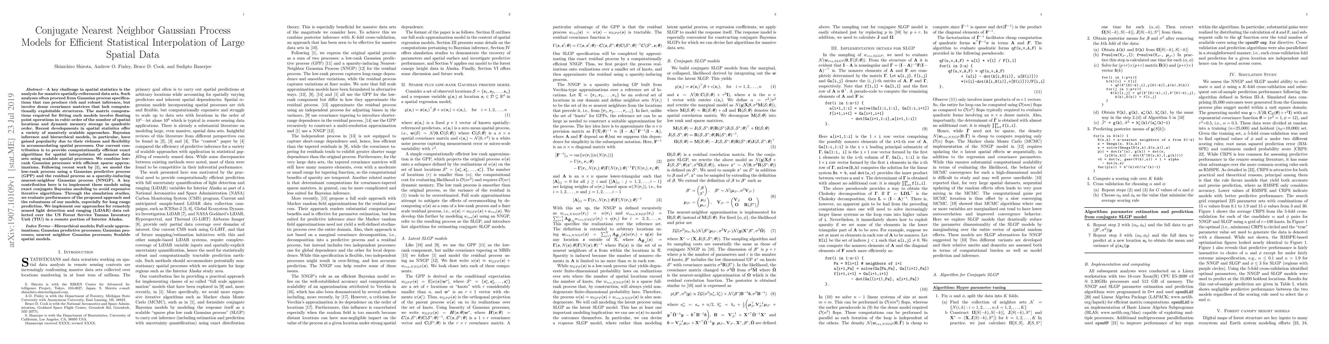 This paper proposes efficient conjugate nearest neighbor Gaussian process models for large spatial data interpolation, combining low-rank Gaussian processes with sparse approximations and exact conjugate Bayesian modeling to avoid iterative computations. The approach is evaluated through simulations and applied to LiDAR data in Alaska.