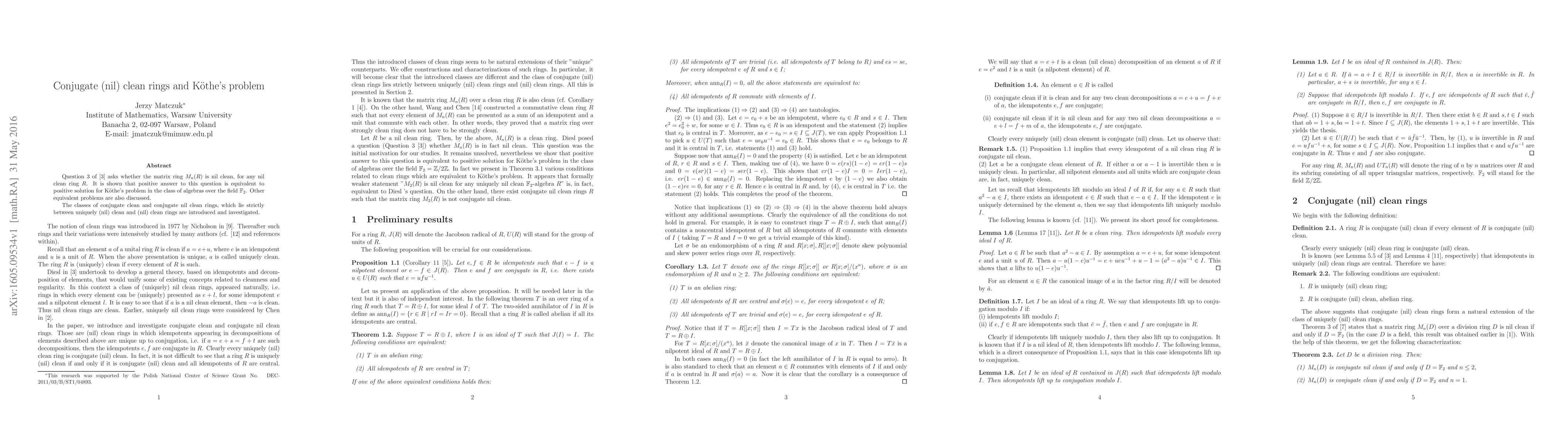 Question 3 of [3] asks whether the matrix ring Mn(R) is nil clean, for any nil clean ring R. It is shown that positive answer to this question is equivalent to positive solution for Kothe's problem in the class of algebras over the field F_2. Other equivalent problems are also discussed. The classes of conjugate clean and conjugate nil clean rings, which lie strictly between uniquely (nil) clean and (nil) clean rings are introduced and investigated.