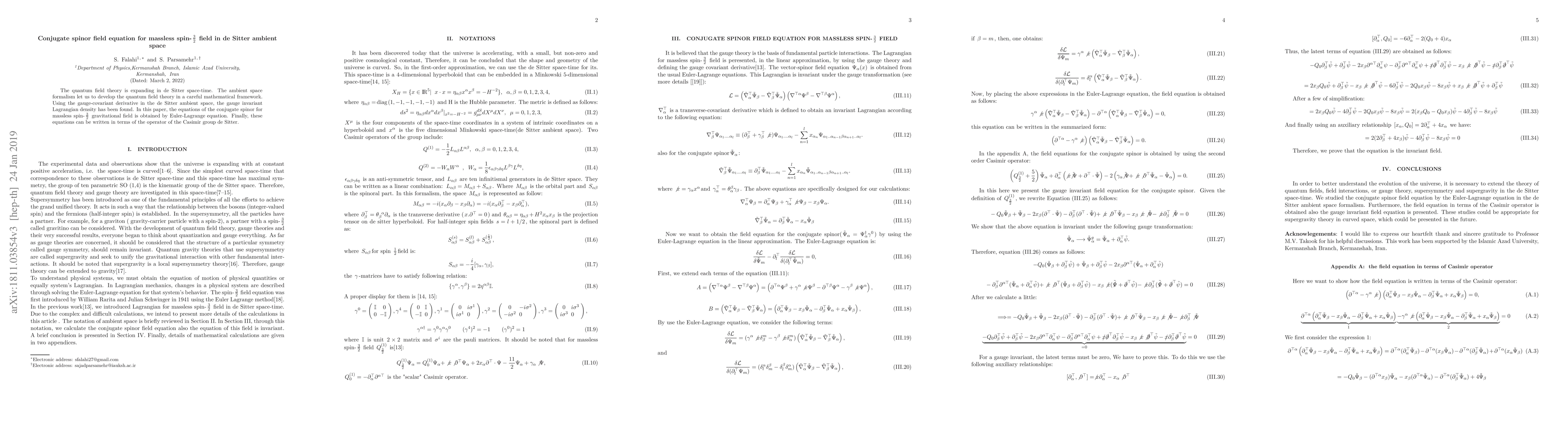 The quantum field theory is expanding in de Sitter space-time. The ambient space formalism let us to develop the quantum field theory in a careful mathematical framework. Using the gauge-covariant derivative in the de Sitter ambient space, the gauge invariant Lagrangian density has been found. In this paper, the equations of the conjugate spinor for massless spin-$\frac{3}{2}$ gravitational field is obtained by Euler-Lagrange equation. Finally, these equations can be written in terms of the operator of the Casimir group de Sitter.