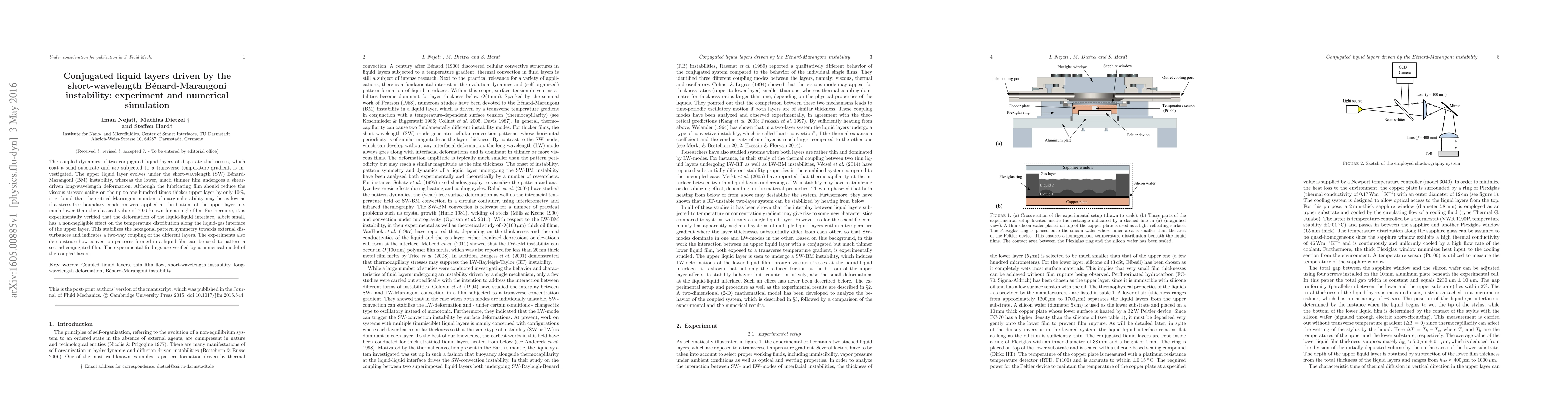 This study investigates the dynamics of two conjugated liquid layers under a transverse temperature gradient, revealing that the lower thin film's shear-driven deformation significantly lowers the critical Marangoni number for instability in the thicker upper layer. The experiments show a two-way coupling effect, stabilizing the convection pattern and demonstrating the potential to pattern a second film, verified by numerical simulations.