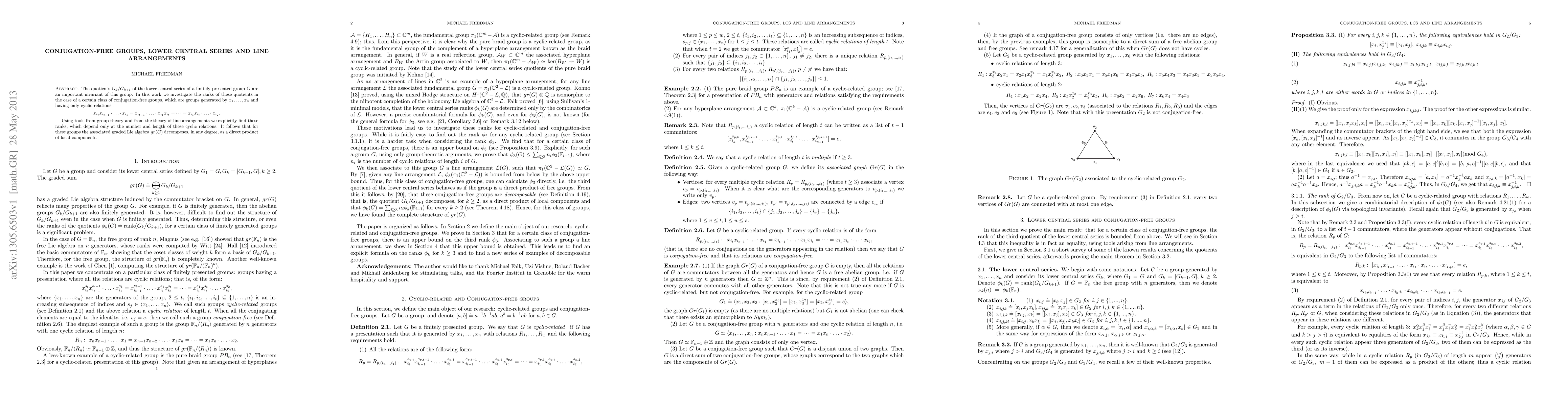 This research examines the ranks of the quotients $G_k/G_{k+1}$ from the lower central series of conjugation-free groups characterized by cyclic relations. Utilizing group theory and line arrangements, the study determines these ranks based on the number and length of the cyclic relations, revealing that the associated graded Lie algebra decomposes as a direct product of local components.