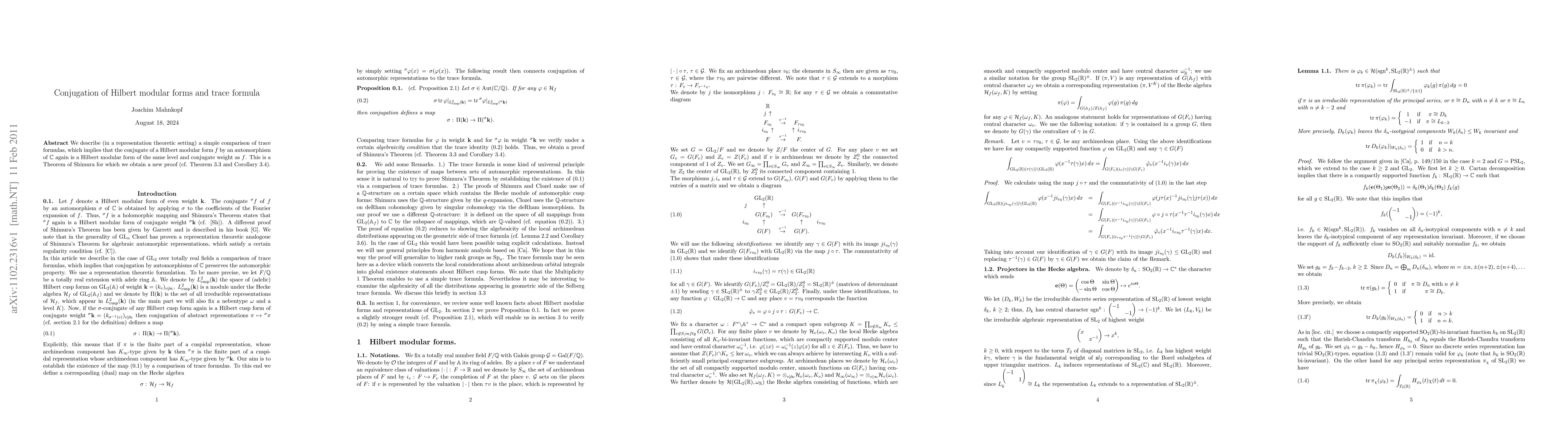 We describe (in a representation theoretic setting) a simple comparison of trace formulas, which implies that the conjugate of a Hilbert modular form $f$ by an automorphism of ${\Bbb C}$ again is a Hilbert modular form of the same level and conjugate weight as $f$. This is a Theorem of Shimura for which we obtain a new proof (cf. Theorem 3.3 and Corollary 3.4