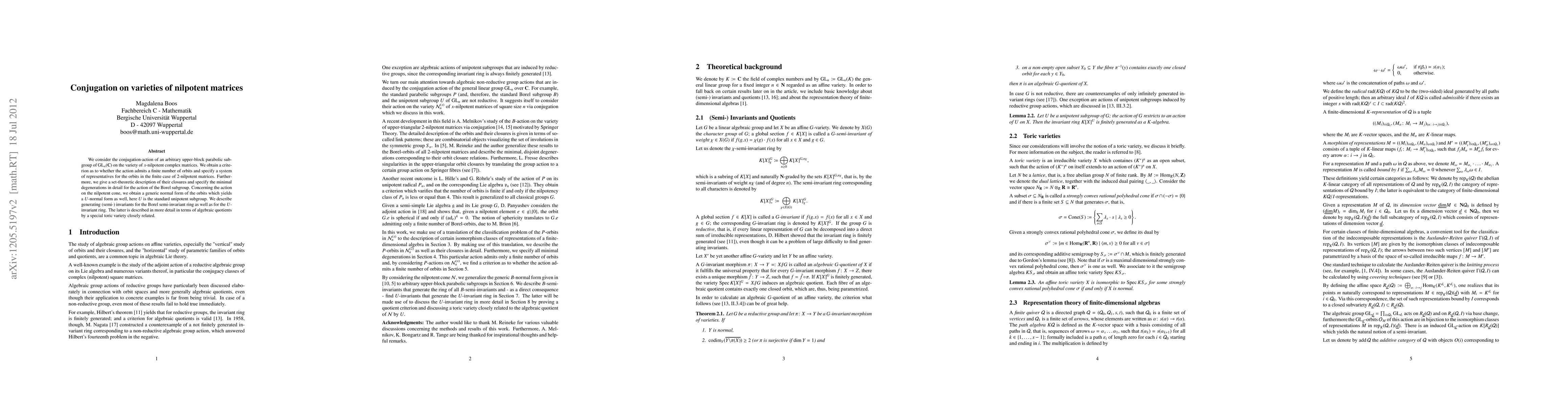 We consider the conjugation-action of an arbitrary upper-block parabolic subgroup of GL_n(C) on the variety of x-nilpotent complex matrices. We obtain a criterion as to whether the action admits a finite number of orbits and specify a system of representatives for the orbits in the finite case of 2-nilpotent matrices. Furthermore, we give a set-theoretic description of their closures and specify the minimal degenerations in detail for the action of the Borel subgroup. Concerning the action on the nilpotent cone, we obtain a generic normal form of the orbits which yields a U-normal form as well, here U is the standard unipotent subgroup. We describe generating (semi-) invariants for the Borel semi-invariant ring as well as for the U-invariant ring. The latter is described in more detail in terms of algebraic quotients by a special toric variety closely related.