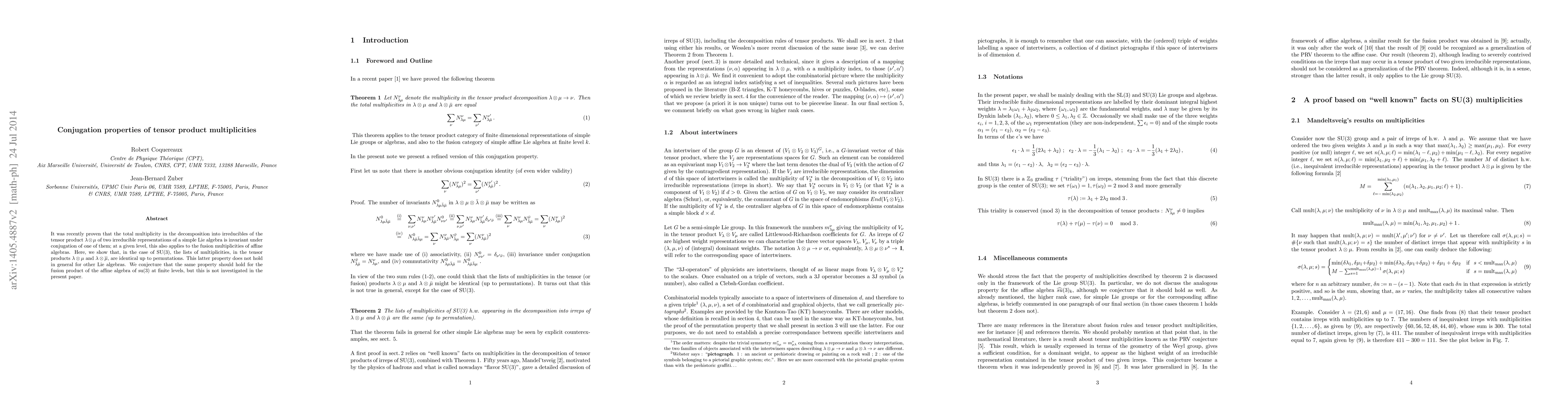 This paper demonstrates that for SU(3), the multiplicities in tensor products of irreducible representations remain invariant under conjugation and are identical in both lambda x mu and lambda x bar{mu} up to permutations, a property not generally true for other Lie algebras. The authors conjecture a similar behavior for the fusion product of affine algebra su(3) at finite levels.