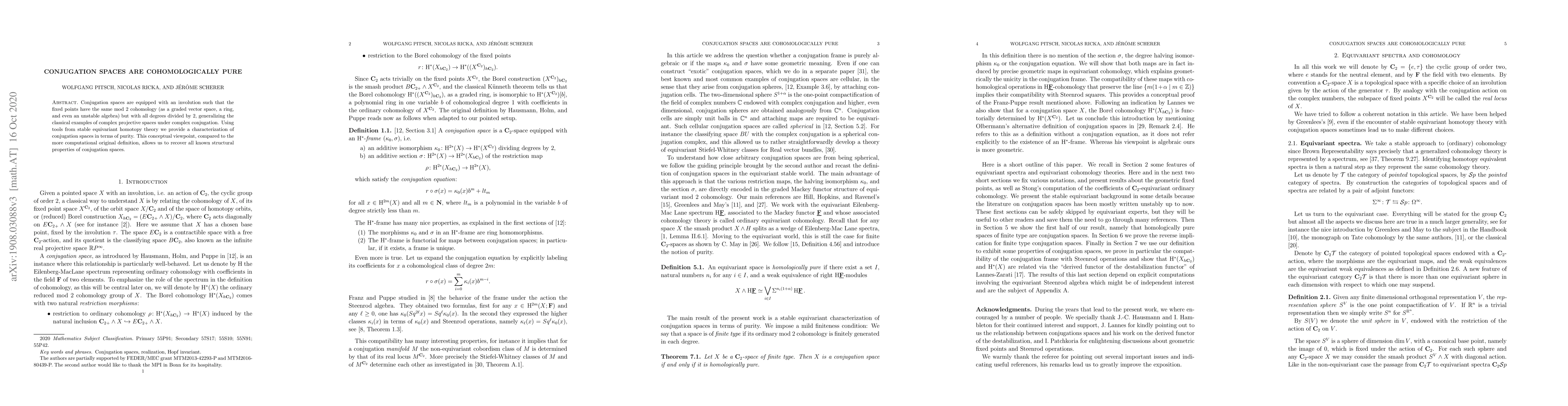 This paper characterizes conjugation spaces, which possess an involution where fixed points share mod 2 cohomology, as cohomologically pure. It uses stable equivariant homotopy theory to redefine these spaces in terms of purity, thereby recovering all known structural properties.