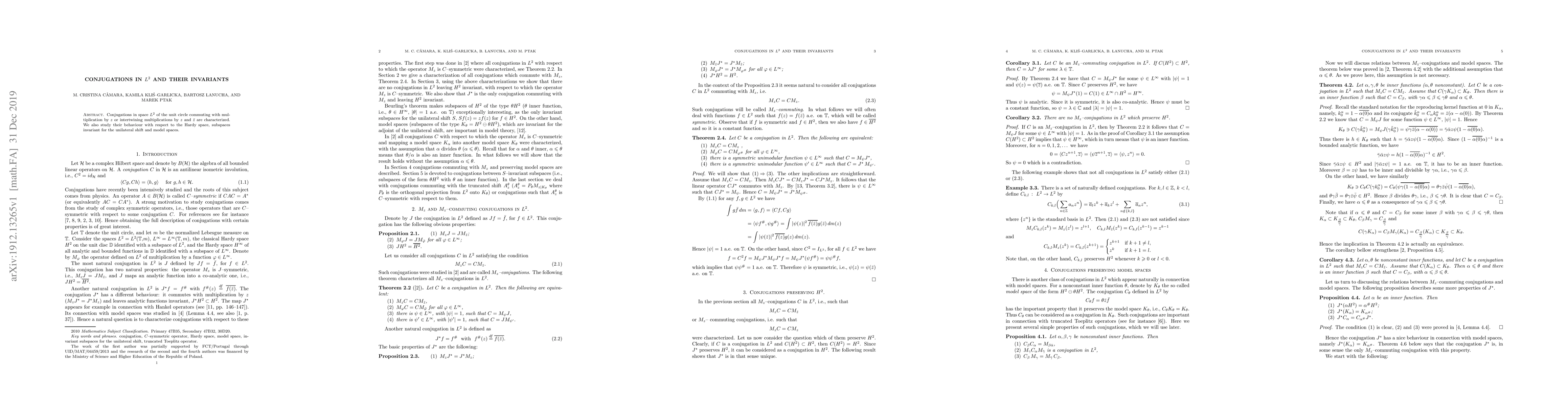 Conjugations in space $L^2$ of the unit circle commuting with multiplication by $z$ or intertwining multiplications by $z$ and $\bar z$ are characterized. We also study their behaviour with respect to the Hardy space, subspaces invariant for the unilateral shift and model spaces.
