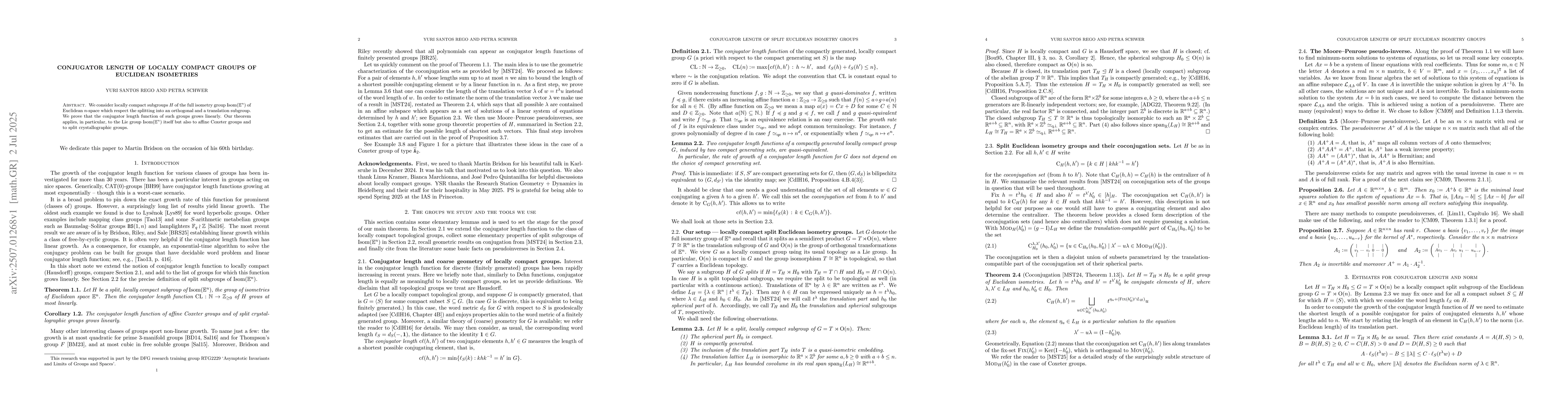 We consider locally compact subgroups $H$ of the full isometry group $\mathrm{Isom}(\mathbb{E}^n)$ of Euclidean $n$-space which respect the splitting into an orthogonal and a translation subgroup. We prove that the conjugator length function of such groups grows linearly. Our theorem applies, in particular, to the Lie group $\mathrm{Isom}(\mathbb{E}^n)$ itself but also to affine Coxeter groups and to split crystallographic groups.