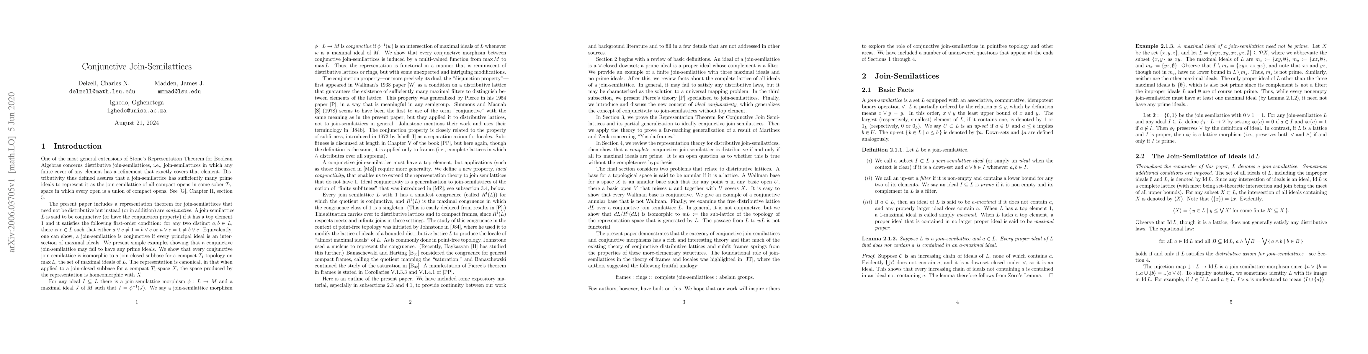 A study on conjunctive join-semilattices reveals that every conjunctive join-semilattice can be represented as a compact T1-topology on its maximal ideals, with specific properties for morphisms and bases.