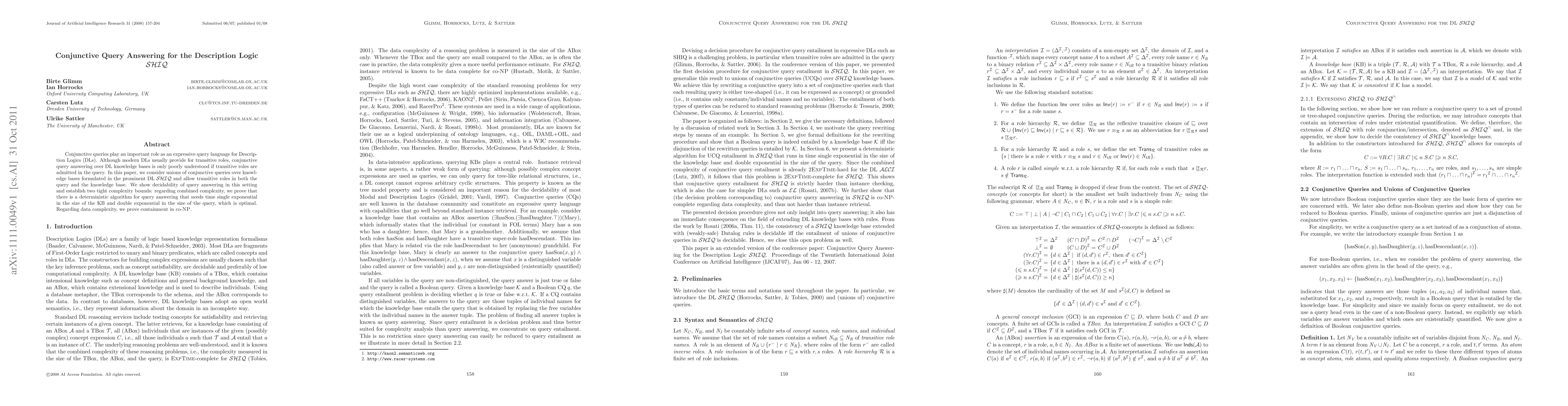 This paper investigates conjunctive query answering in the context of the SHIQ Description Logic, allowing transitive roles in both queries and knowledge bases. It establishes decidability and provides optimal complexity bounds, showing a single exponential time complexity in the knowledge base size and double exponential in the query size for combined complexity, and containment in co-NP for data complexity.